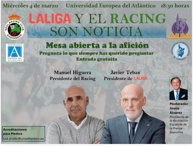 La Asociación Española de la Prensa Deportiva (AEPD), en colaboración con la Asociación de la Prensa Deportiva de Cantabria (APDC), han programado una interesante mesa redonda en la que participarán Manuel Higuera, presidente del Racing, y Javier Tebas, presidente de LaLiga. El encuentro, que será moderado por el periodista y presidente a la AEPD, Jesús […]