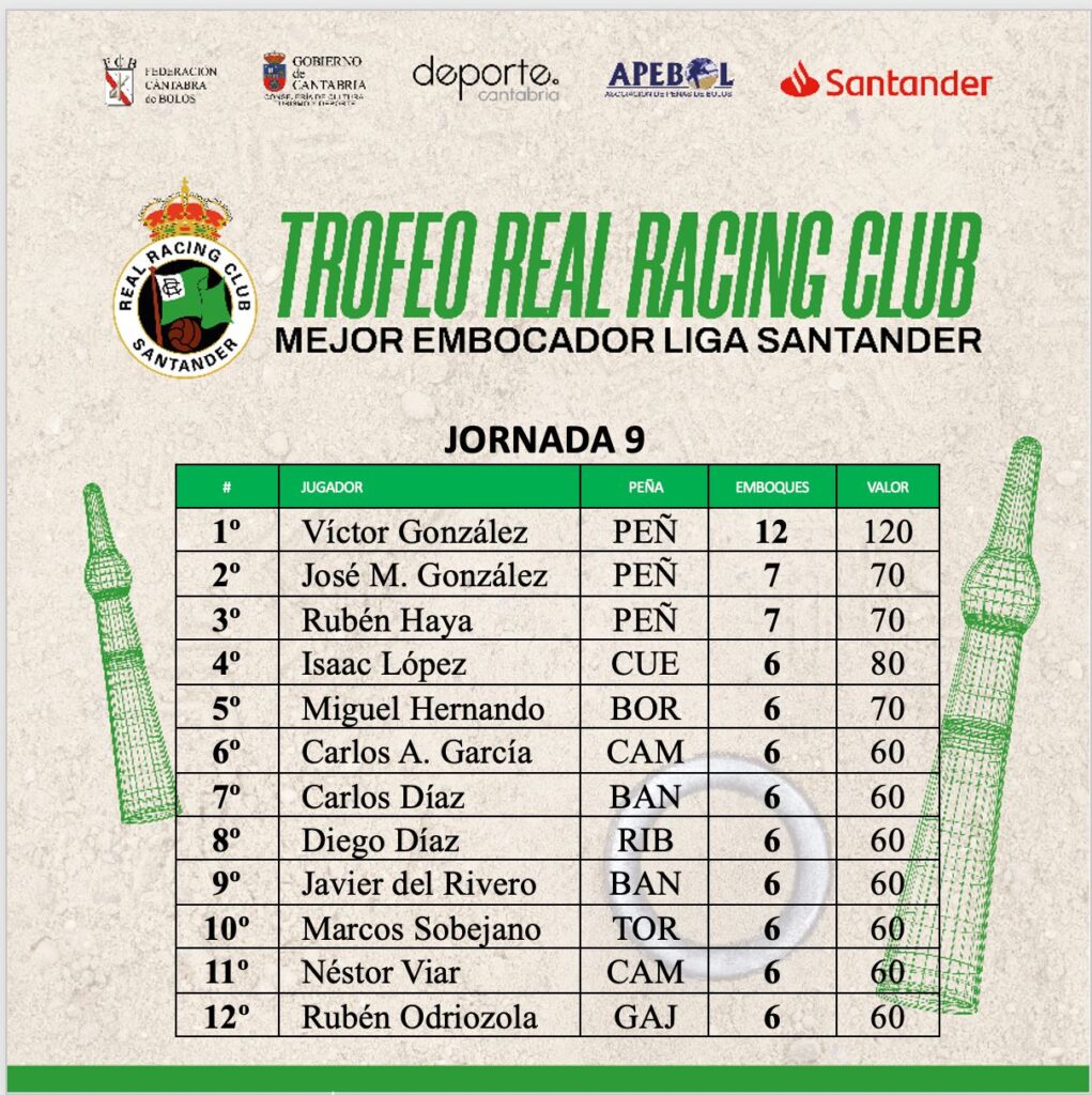 Tras la novena jornada de la Liga Santander, disputada el pasado fin de semana, tres jugadores de la Peña Peñacastillo Anievas Mayba encabezan la clasificación del Trofeo Real Racing Club al Mejor Embocador. Sigue al frente de la tabla, Víctor González y le siguen su hermano José Manuel y Rubén Haya. A continuación, en las […]