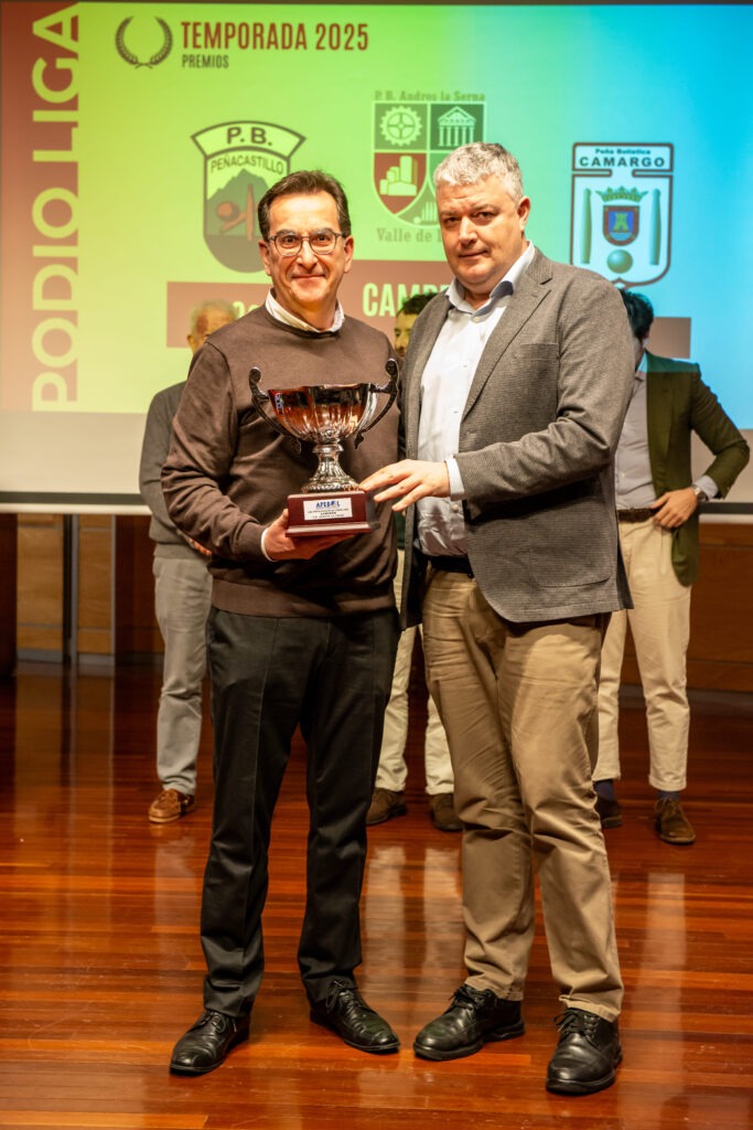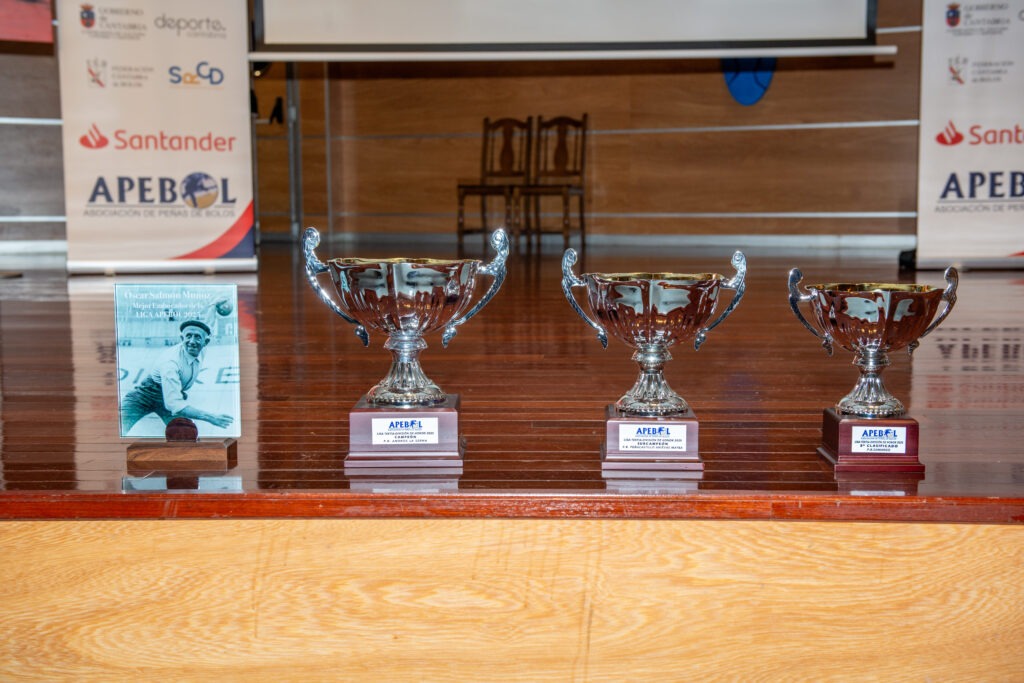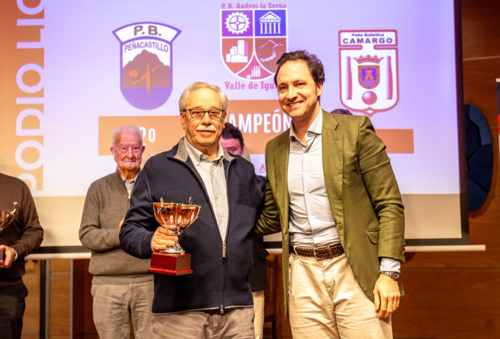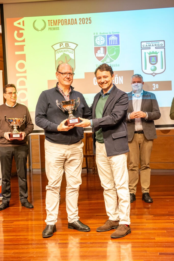 Como ‘carpetazo’ a la temporada 2025, José Luis Díaz, vicepresidente de la Peña Andros La Serna Valle de Iguña; José Manuel González, presidente de la Peña Peñacastillo Anievas Mayba; y Gerardo Castanedo, presidente de la Peña Camargo, recibieron los trofeos como campeón, subcampeón y tercer clasificado, respectivamente, de la Liga finalizada el pasado mes de agosto. Asimismo, Héctor Salmón recogió el trofeo al máximo embocador, que ganó su hermano Óscar, que no pudo asistir por problemas laborales.