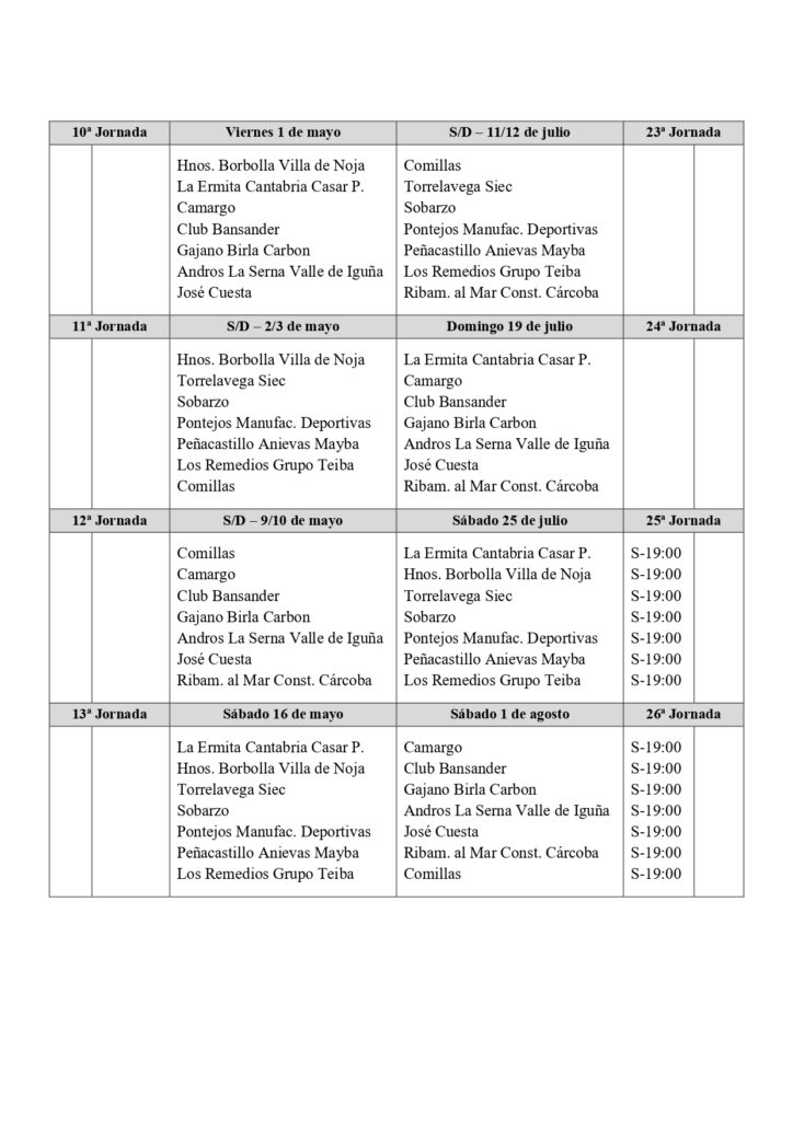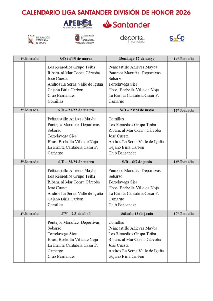 Con las últimas bolas sobre el escenario arrancó el sorteo del calendario de la Liga Santander 2026, cuyo desarrollo fue muy bien explicado por José Ángel Hoyos, puesto que está condicionado a la proximidad geográfica y la coincidencia de boleras auxiliares. Todo ello propició una primera jornada (14-15 de marzo) en la que los partidos serán: Los Remedios Grupo Teiba-Peñacastillo Anievas Mayba; Ribamontán al Mar Construcciones Cárcoba-Pontejos Manufacturas Deportivas; José Cuesta-Sobarzo; Andros La Serna Valle de Iguña-Torrelavega Siec; Gajano Birla Carbón-Hnos. Borbolla Villa de Noja; Club Bansander-La Ermita Cantabria Casar de Periedo; y Comillas-Camargo.