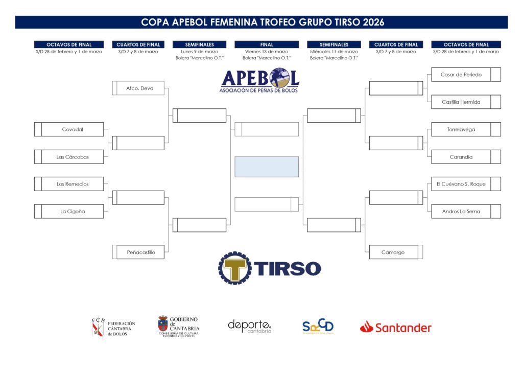 Llegado este punto y con los jóvenes Lucía Miranda y Adrián Guardo, alumnos de las Escuelas Manuel García de La Cavada y Peñacastillo de Santander, comenzó la parte más interesante de la velada, como es el sorteo de los diferentes calendarios. En primer lugar las extracciones arrojaron los enfrentamientos de la Copa Apebol femenina-Trofeo Grupo Tirso, cuya fase previa comenzará el 28 de febrero. De ésta estarán exentos los tres primeros de la Liga Bolos en Femenino del año pasado al haberse inscrito 13 equipos. Los enfrentamientos serán: Covadal-Las Cárcobas Clima Norte (el ganador se verá las caras en cuartos con Atlético Deva) Los Remedios Grupo Teiba-La Cigoña (el ganador en cuartos frente a Peñacastillo Anievas Mayba), Casar de Periedo Bar El Gallo-Castilla-Hermida Confitería Hojaldres, Torrelavega Siec-Carandía y El Cuévano-Andros La Serna Valle de Iguña (el ganador en cuartos ante Camargo). La final, que se jugará en la bolera de Cueto, está prevista para el 13 de marzo.
