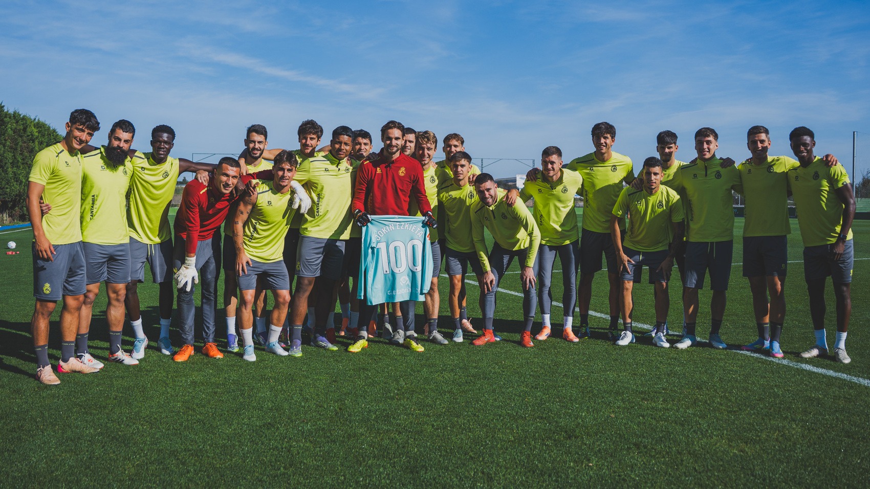 Jokin Ezkieta recibió, acompañado por sus compañeros, la camiseta conmemorativa de sus 100 partidos oficiales como jugador del Racing. El guardameta navarrovalcanzó esta cifra con su titularidad ante el Fútbol Club Andorra tras un camino que comenzó el 22 de diciembre de 2022 en la casa del Linares Deportivo en la Copa del Rey.