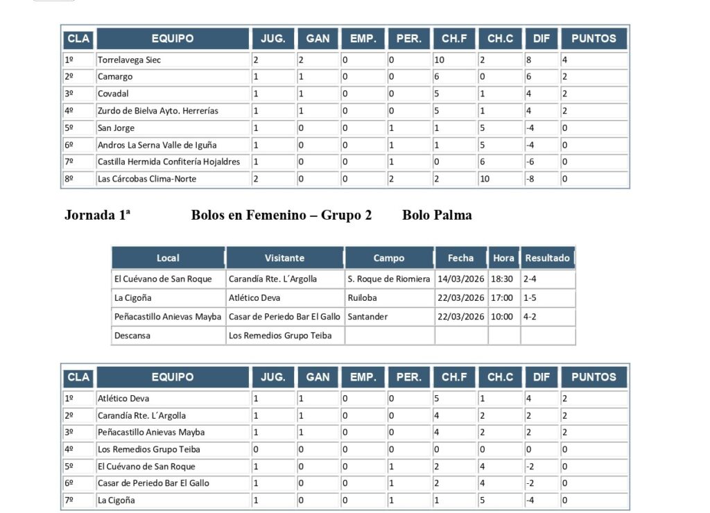 En el grupo 1 encabeza la clasificación Torrelavega Siec, pero hay que tener en cuenta que ha ganado los dos partidos disputados -uno adelantado-, todo lo contrario que Las Cárcobas Clima Norte, con dos encuentros no ha logrado sacar ningún punto. No fallaron en el inicio ni Camargo, ni Covadal, ni Zurdo de Bielva Ayuntamiento de Herrerías.