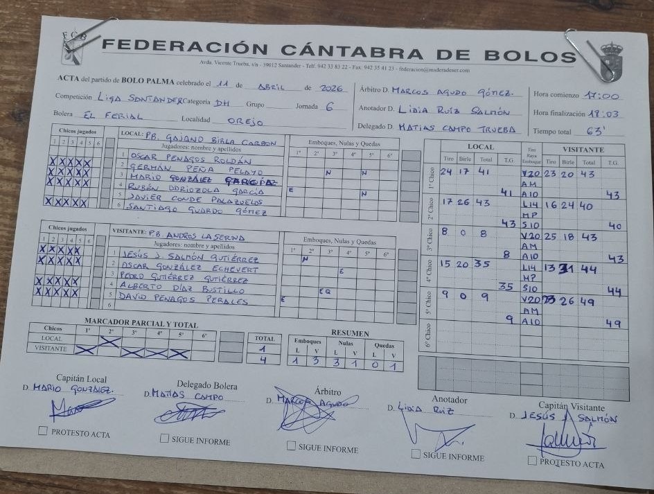 Andros La Serna Valle de Iguña ha ascendido a la tercera posición de la tabla tras reencontrarse con la victoria (1-4) -llevaba dos empates y una derrota en los últimos tres partidos-. Hubo cambio en las filas de los de Las Fraguas, jugando Alberto Díaz en lugar de Pedro Gutiérrez. Los actuales campeones hicieron lo suficiente para cerrar todos los chicos con la ‘ayuda’ de los emboques de Penagos, Alberto y Óscar, aunque en el segundo la nula de Salmón les impidió hacer pleno, no pudieron superar los 43 de un Gajano Birla Carbón, que en esta ocasión no tuvo su día.