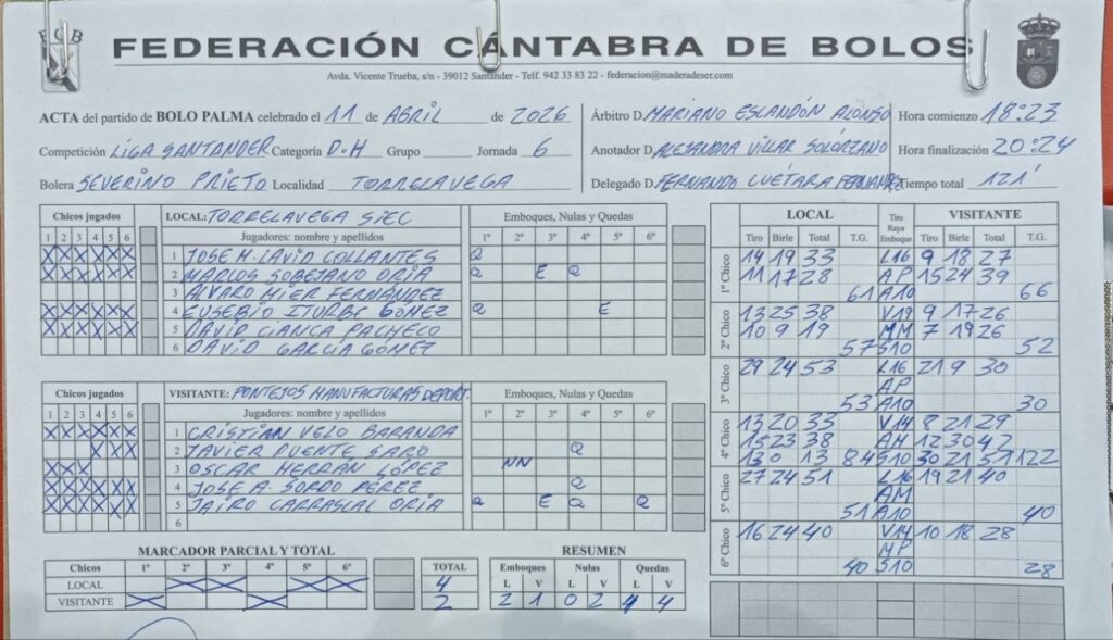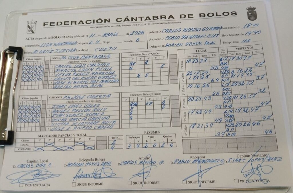 José Cuesta llegaba tras tres derrotas consecutivas a Cueto, donde le esperaba un Club Bansander, que llevaba dos empates seguidos. Los de Cerrazo no parecía que acertaban con el tiro ganador, así que apostaron por los 20 metros y la jugada les salió bien, aunque en esta ocasión también acertaron desde 17, pero desde donde sí que fueron efectivos fue desde el birle, desde donde fraguaron su triunfo ante los santanderinos, que esta vez no tuvieron una buena tarde de juego. En este encuentro hubo una jugada no vista por muchos de los que estábamos en la Marcelino Ortiz Tercilla. En la segunda tirada del segundo chico, José Cuesta mandó a ganar a Bansander a 19, una cifra lógicamente muy asequible, pero… ‘caballo’ de Rivero y seis bolas blancas: 1 de tiro. Lo que en principio era asequible ya no lo parecía tanto, pero los locales lograron meterse en el encuentro (1-1) tras birlar bien.