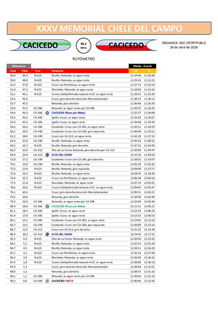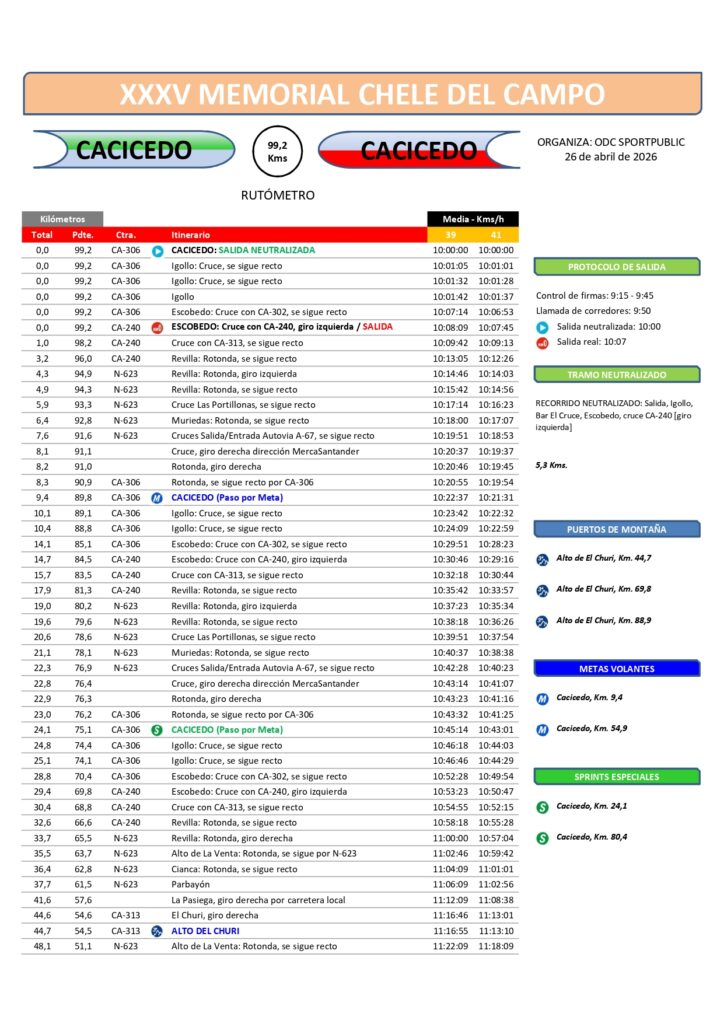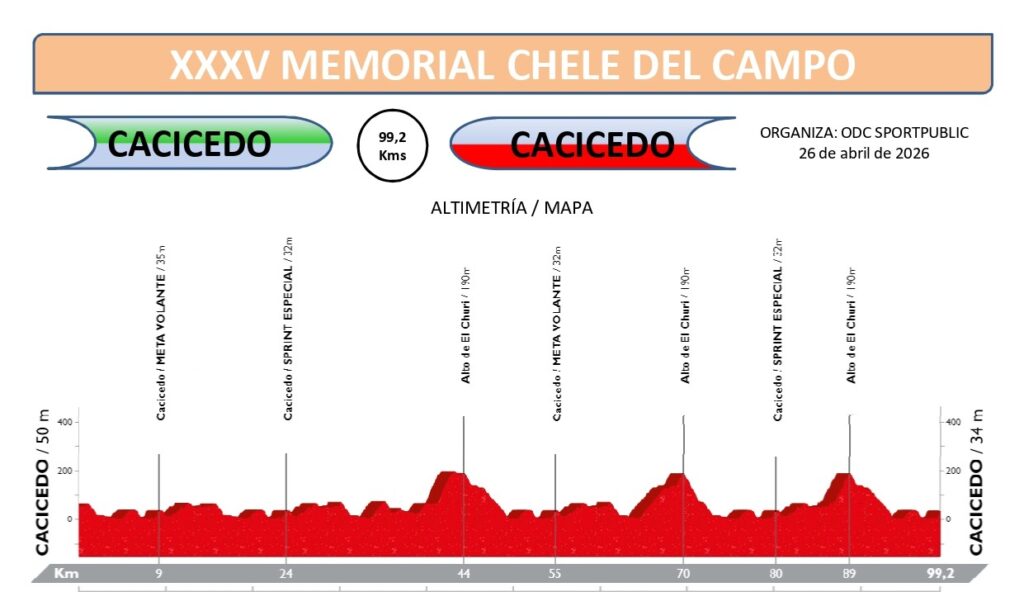 Al día siguiente, es decir, el domingo, día 26, a partir de las 10.00 horas, tendrá lugar el XXXV Memorial Chele del Campo, de 99,2 kilómetros, con epicentro en Cacicedo de Camargo, puesto que en esta localidad no solo estarán instaladas salida y llegada, sino que también habrá dos metas volantes (km. 9,4 y 54,9) y otros dos sprints especiales (km. 24,1 y 80,4). Al igual que el día anterior, los ascensos a El Churi (44,7, 69,8 y 88,9) serán claves.