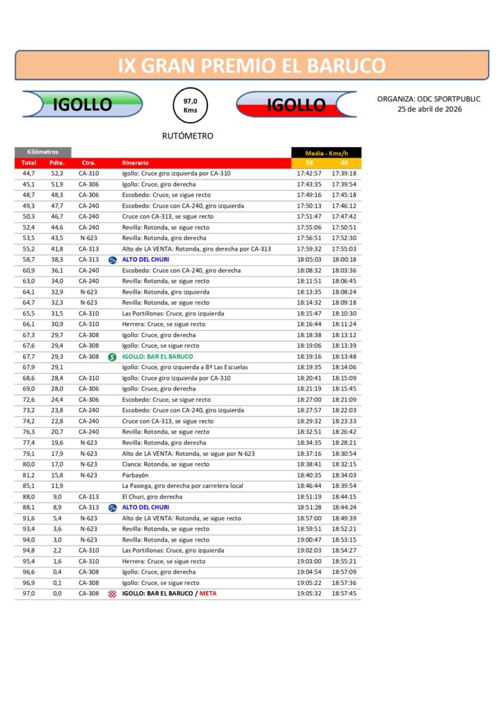 El sábado, día 25, a partir de las 16.30 horas, se disputará el IX Gran Premio El Baruco, de 97 kilómetros, con salida y llegada en Igollo, donde también estarán instaladas las metas volantes (km. 12,3 y 43,8) y sprints especiales (km. 25,9 y 67,7). Una vez más los tres pasos de montaña por El Churi (km. 34,6, 58,7 y 88,1) marcarán el devenir final de la carrera.