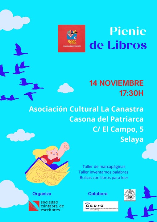 Pícnic de LibrosFechaviernes, 21/11/2025Horario: 17:30h Lugar: Casa del Pueblo de Monte Organiza: Sociedad Cántabra de Escritores Precio: Entrada libre. Tras el éxito de los Pícnics de Libros del año 2024, celebrados en Santander en colaboración con varias asociaciones de vecinos, y en los que participó un cuantioso número de familias, la Sociedad Cántabra de Escritores […]