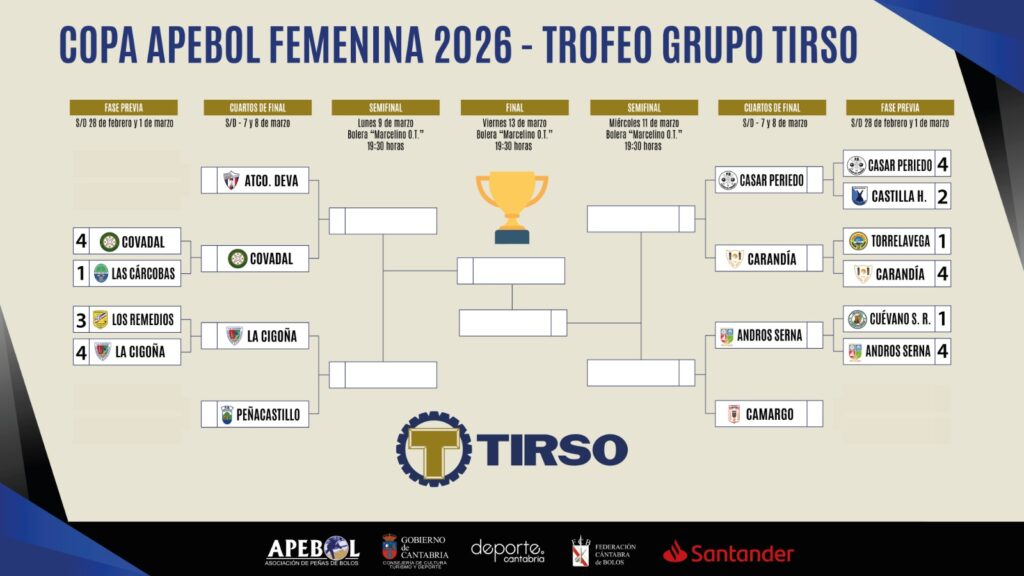 Los cuatro equipos ganadores de esta eliminatoria disputarán las semifinales (lunes 9 y miércoles 11) en la bolera Marcelino Ortiz Tercilla de Cueto, donde el viernes 13 tendrá lugar la final.