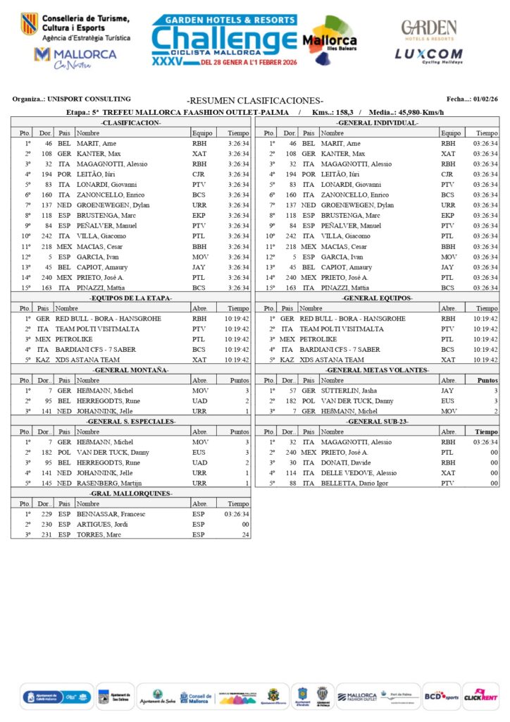 La victoria ha sido para el belga Arne Marit (Red Bull–Bora–Hansgrohe), que se ha impuesto con autoridad en la llegada masiva del Paseo Marítimo, firmando un tiempo de 3h26.34’. Con este triunfo, el conjunto alemán completa un brillante póker de victorias en la presente edición de la Challenge, confirmando su dominio en la ronda mallorquina.