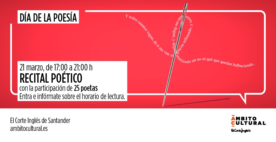 Con un recital poético ininterrumpido, de cuatro horas en la Sala de Ámbito Cultural de El Corte Inglés Santander en el que 25 poetas compartirán su voz, su obra y su sensibilidad con el público, se suma a la festividad del día de la poesía el próximo día 21 de marzo.