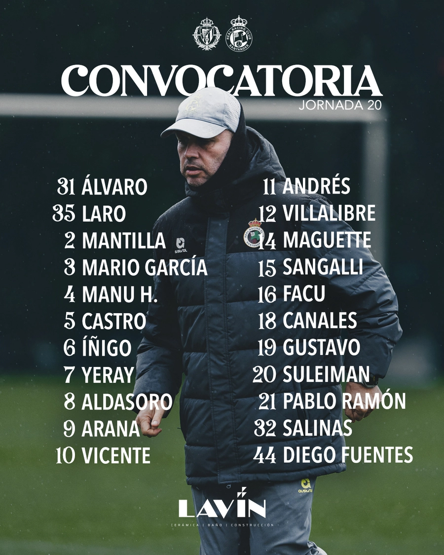 La principal novedad de la convocatoria presentada por José Alberto es la presencia de los dos porteros del filial Laro y Álvaro Jiménez ante la baja por lesión de Ezkieta -continúa recuperándose de la lesión en el hombro derecho sufrida en Cádiz- y la próxima salida del club de Andreev. Además, Michelin también ocupa plaza en la enfermería y el entrenador asturiano ha incluido en la citación al jugador del Rayo Diego Fuentes ‘Chino’, que este curso se estrenó con el primer equipo ante la Sociedad Deportiva Ponferradina en la Copa del Rey.