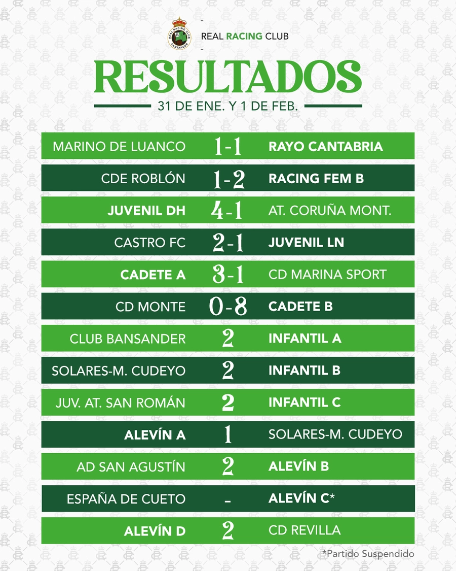 El Cadete A derrotó con solvencia al Marina Sport en La Albericia (3-0). Mario Zavala, Lucas Martínez y Miguel Tejero fueron los autores de los tantos racinguistas. Y el Cadete B se llevó los tres puntos ante el Monte ‘B’ (0-8) gracias al hattrick de Bastian Stegen, el doblete de Román Colsa y las dianas de Quino, Santi Sordo y Gon López.