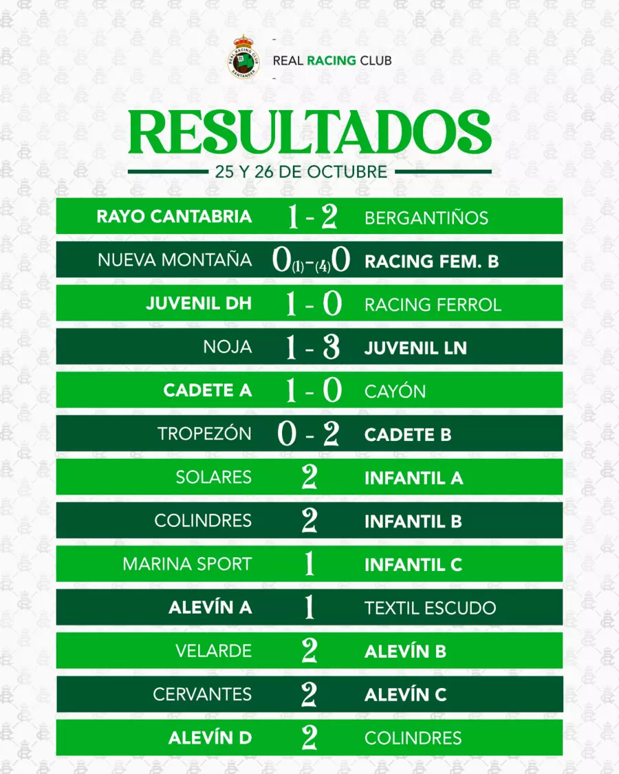 En Liga Nacional, los de Raúl Val ganaron a la Sociedad Deportiva Noja (1-3) en el octavo encuentro del curso 2025/26. Los racinguistas comenzaron por detrás en el marcador tras el tanto inicial de Izan Valle. Sin embargo, los visitantes se repusieron rápido y dieron la vuelta al marcador gracias al tanto de Rodrigo Gómez y al doblete de Lucas Echevarría.