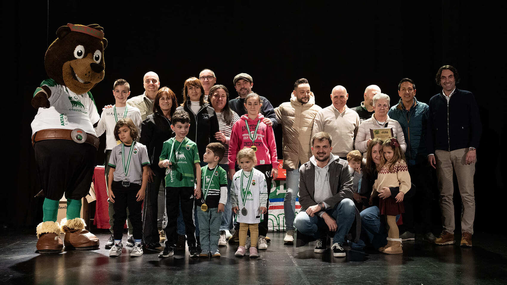 El Racing mostró su apoyo, un año más, al concurso de dibujo organizado por la Peña San José 1913, que contó con la participación de casi 200 niños y niñas -la mayoría de El Astillero-, el municipio donde tiene su sede esta agrupación verdiblanca. Así, el presidente del club, Manolo Higuera, la consejera Miriam Peña y el oso Cacho acudieron a la Sala Bretón para participar en la entrega de premios del certamen, entre los que se incluyeron una camiseta oficial del conjunto racinguista y diverso merchandising del club, entre los que figuraba el póster oficial de la temporada 2025/26 realizado junto a la santanderina Grúa de Piedra.
