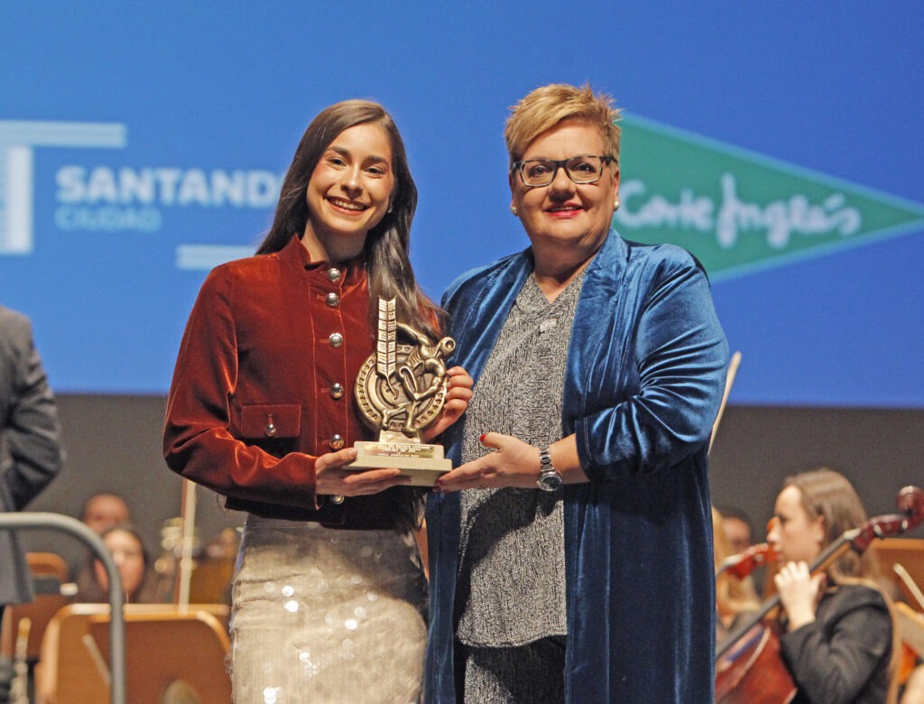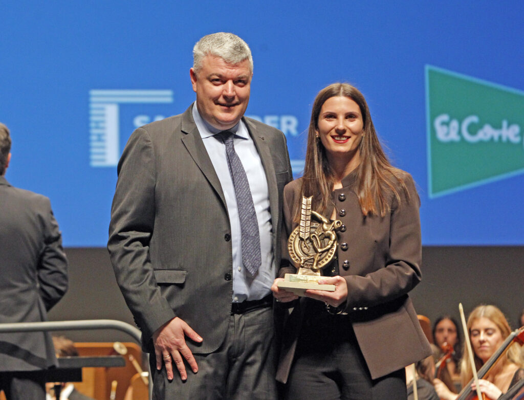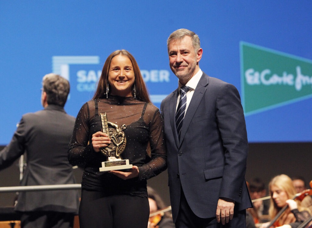 Siguiendo con los jóvenes apareció sobre el escenario una atleta que más que promesa, está en camino de convertirse en una estrella del atletismo español en lanzamientos. Campeona de Europa sub-20 de disco, la primera española en conseguirlo. Beatriz Pellón, concejala de Deportes del Ayuntamiento de Santander, entregó el premio a Andrea Njimi Tankeu, que para 2026 tiene como principal objetivo conseguir el récord de España y escalar posiciones en la categoría absoluta “que no lo tengo muy lejos”, sin olvidar sus estudios “aunque me está costando un poco compaginar la universidad, que es mi primer año, y los entrenamientos”.