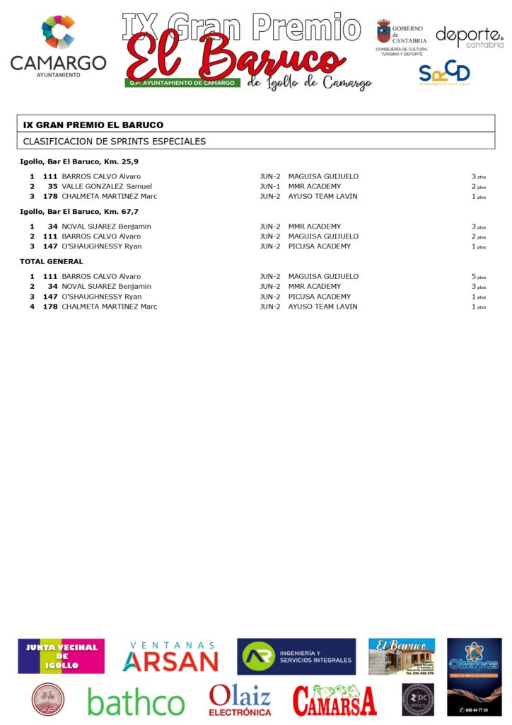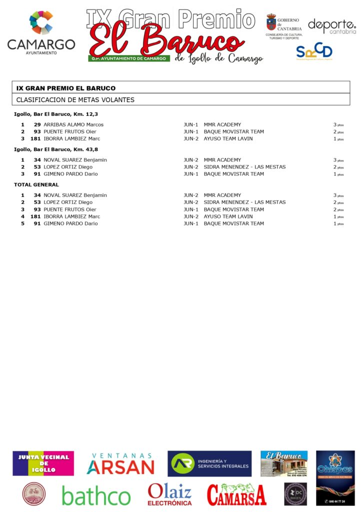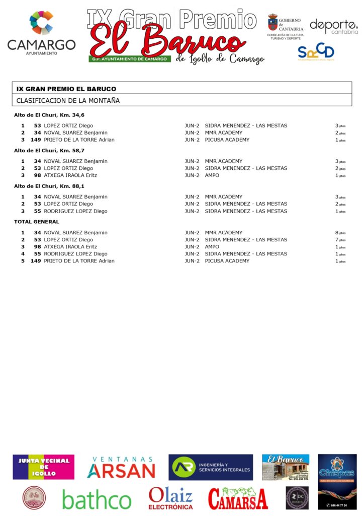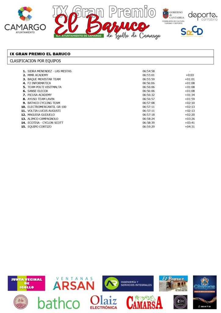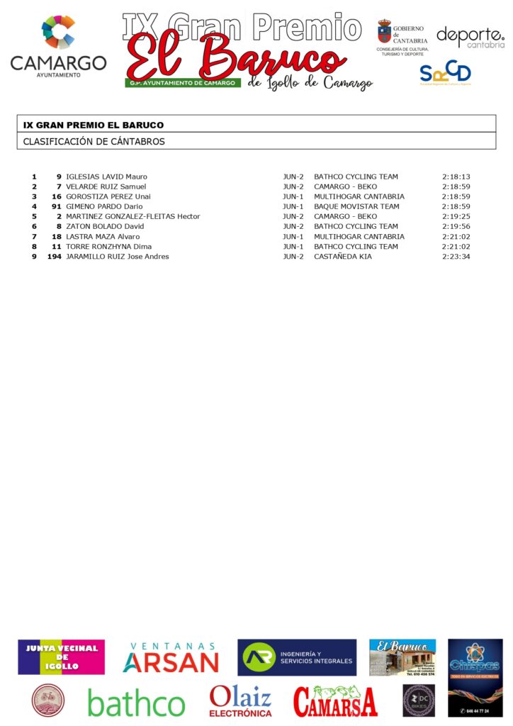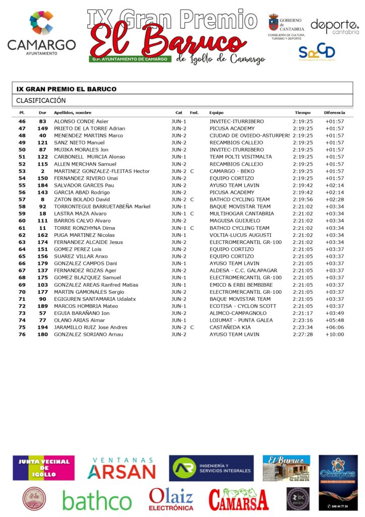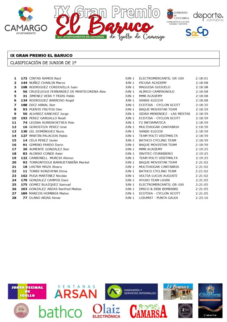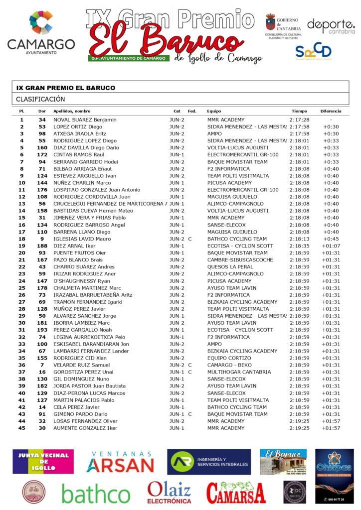 Brillante jornada de ciclismo en Camargo, organizada por Sportpublic ODC. 191 corredores de categoría junior, representando a 32 equipos, participaron en el IX Gran Premio El Baruco, que tuvo su epicentro en Igollo. La prueba no defraudó al numeroso público que siguió su desarrollo a lo largo del recorrido. La excelente climatología también contribuyó al éxito.