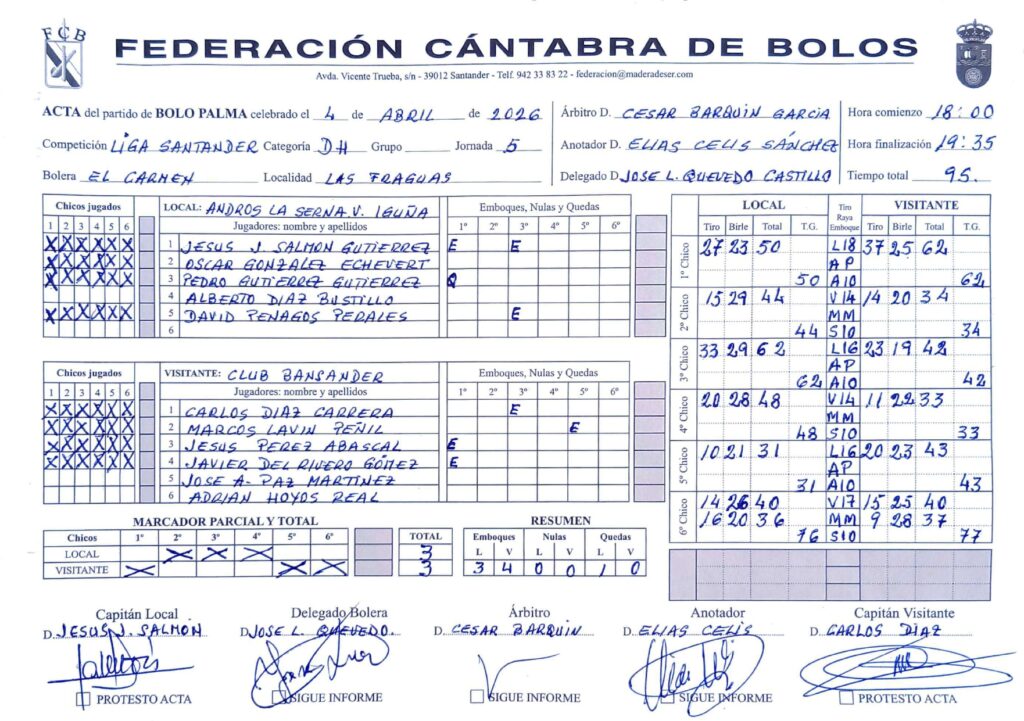 Con la intención de disfrutar y de intentar jugar bien ‘viajaba’ el Club Bansander hasta Las Fraguas. Para los jóvenes de la peña santanderina era una jornada histórica. En su primera temporada en la máxima categoría se iban a enfrentar al actual campeón de Liga, pudiendo mirar de tu a tu a grandes de este deporte como Jesús Salmón u Óscar González. Andros La Serna Valle de Iguña llegaba a este choque tras el mal partido realizado en Maliaño, que finalizó con derrota ante Camargo, lo que invitaba a pensar que Bansander iba a pagar ‘los platos rotos’ como se suele decir. Pero… Bansander arrancó un empate histórico y además no solo puede ‘presumir’ de haberle hecho tres chicos, sino que además comenzó ganando tras ‘matar’ los 51 a los que Andros le había mandado a ganar. Jesús Pérez y Javier del Rivero acertaron con el emboque. A partir de ahí a los visitantes le tocó sufrir, pero no se dieron por vencidos y sí aprovecharon sus opciones para ponerse 3-2. En el último chico, Bansander cambió el tiro, se fue a los 17 metros, porque desde 14 no habían estado bien. Lograron cerrar (15/20) y Andros tras subir 14 necesitó ‘ver’ el panojo (26) para igualar y forzar la segunda tirada. Los santanderinos lograron hacer 37 a pesar de haber subido solo nueve, mandando a ganar a 38, una cifra que para los jugadores de Las Fraguas parecía asequible, pero los nervios tan juegan y está claro que Andros no está fino, se quedó en 36 después de subir 16 y solo lograr 20 de birle.