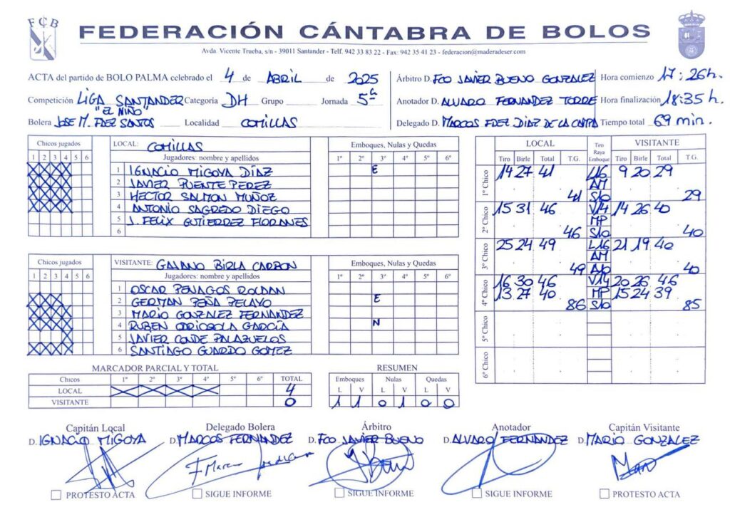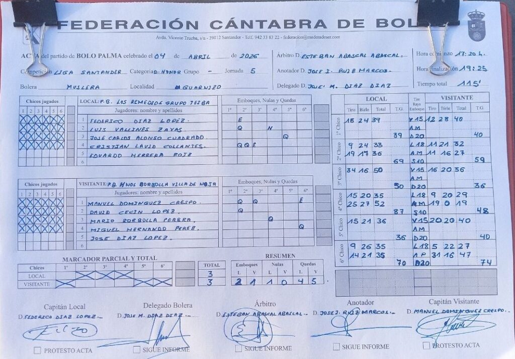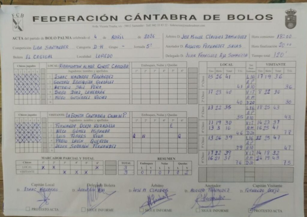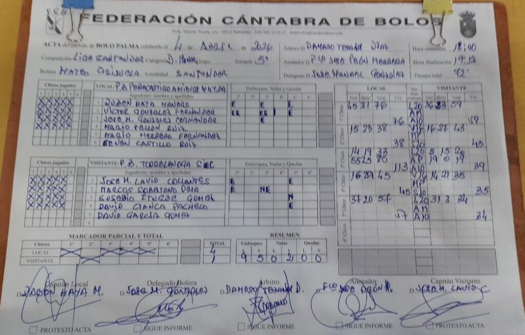 El tercer chico fue clave y único que se jugó de dos tiradas. Los santanderinos no lograron cerrar (33), pero los torrelaveguenses no aprovecharon la ocasión, subieron solo 5 (nula de Sobejano) y birlaron 15 para quedarse en 20 (-13). Y… se cumplió la máxima de que cuando perdonas… De segundas Peñacastillo, con cuatro emboques subió 55 y birló 25 para mandar a ganar a 94 lo que era una grandísima obligación y había sí o sí que acertar con el ‘chiquitín’, pero ya se sabe que cuando hace falta… Acertó Sobejano, pero era demasiado tarde. 19 de tiro y bolas abajo (2-1). A partir de ahí, el encuentro se decantó claramente del lado local. 46 a ganar en el cuarto; y 58 en el quinto y definitivo (4-1).