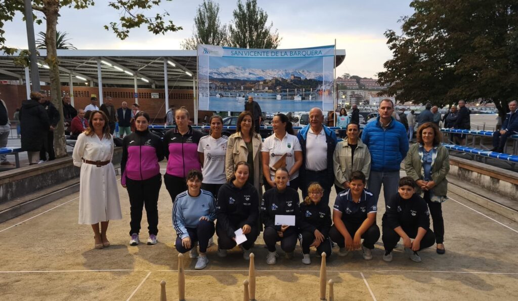 Entregaron los premios: Charo Urquiza, alcaldesa de San Vicente de la Barquera; los concejales María Paz Martínez, Eva Balbín, Demelsa Noriega y Fernando García; el presidente de la Federación Cántabra de Bolos, Julián Vélez; y Carla González, jugadora de la Escuela de San Vicente.