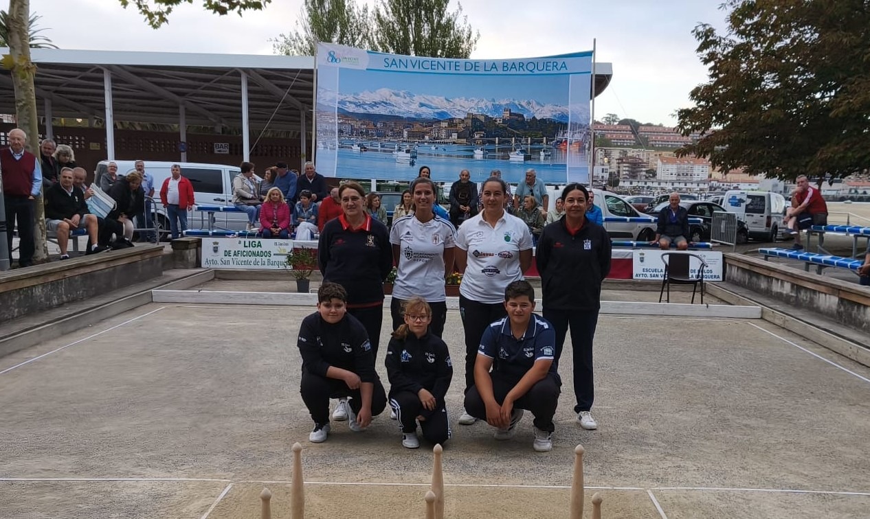 Entregaron los premios: Charo Urquiza, alcaldesa de San Vicente de la Barquera; los concejales María Paz Martínez, Eva Balbín, Demelsa Noriega y Fernando García; el presidente de la Federación Cántabra de Bolos, Julián Vélez; y Carla González, jugadora de la Escuela de San Vicente.