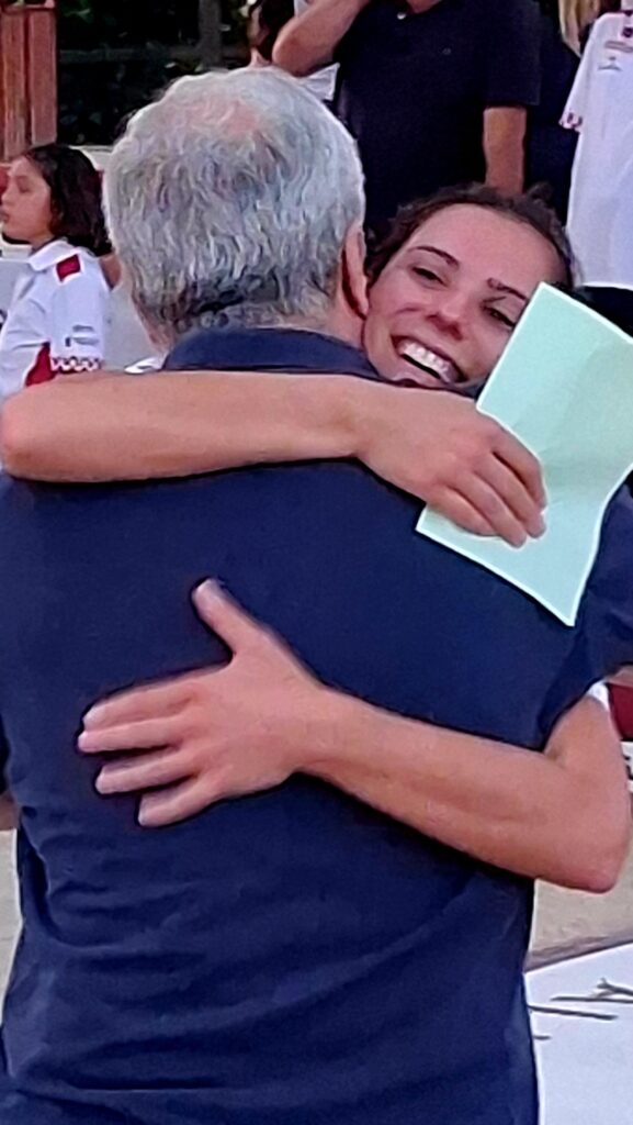 Marta Castillo recibiendo la felicitación de su presidente, Gerardo Castanedo.