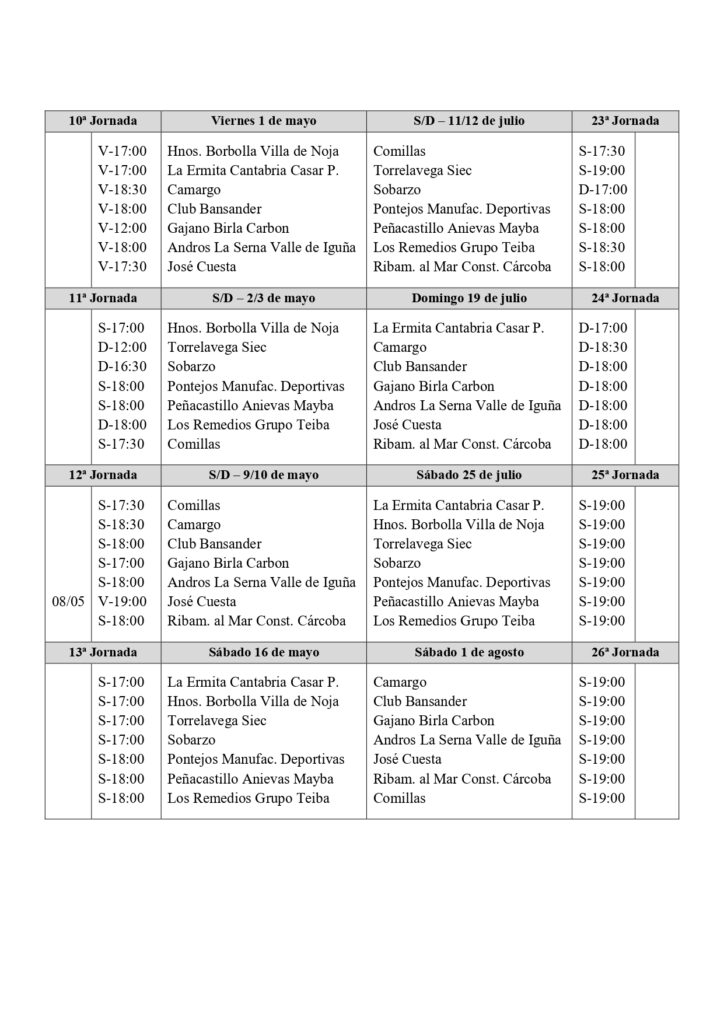 La Federación Cántabra de Bolos hizo público este jueves el calendario definitivo de la División de Honor, que tras 26 jornadas finalizará su fase regular el 1 de agosto, siendo al fin de semana siguiente el playoff de permanencia, que tendrá que disputar el clasificado en el puesto 12 con el ganador de la eliminatoria de Primera categoría.