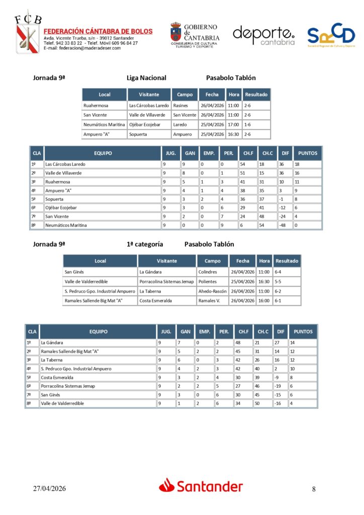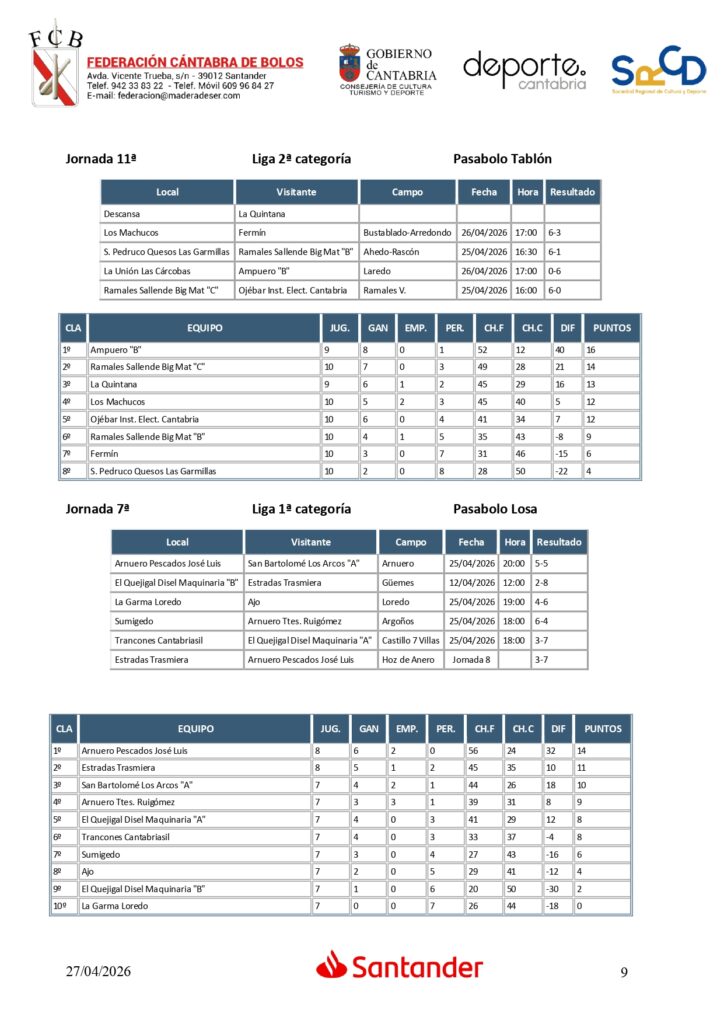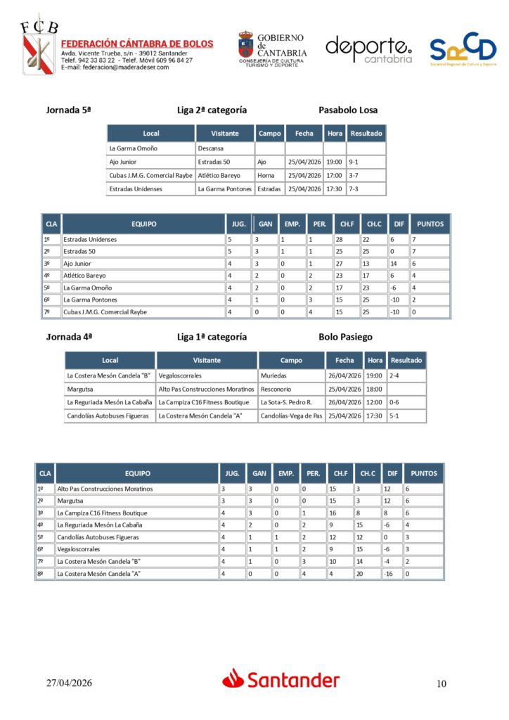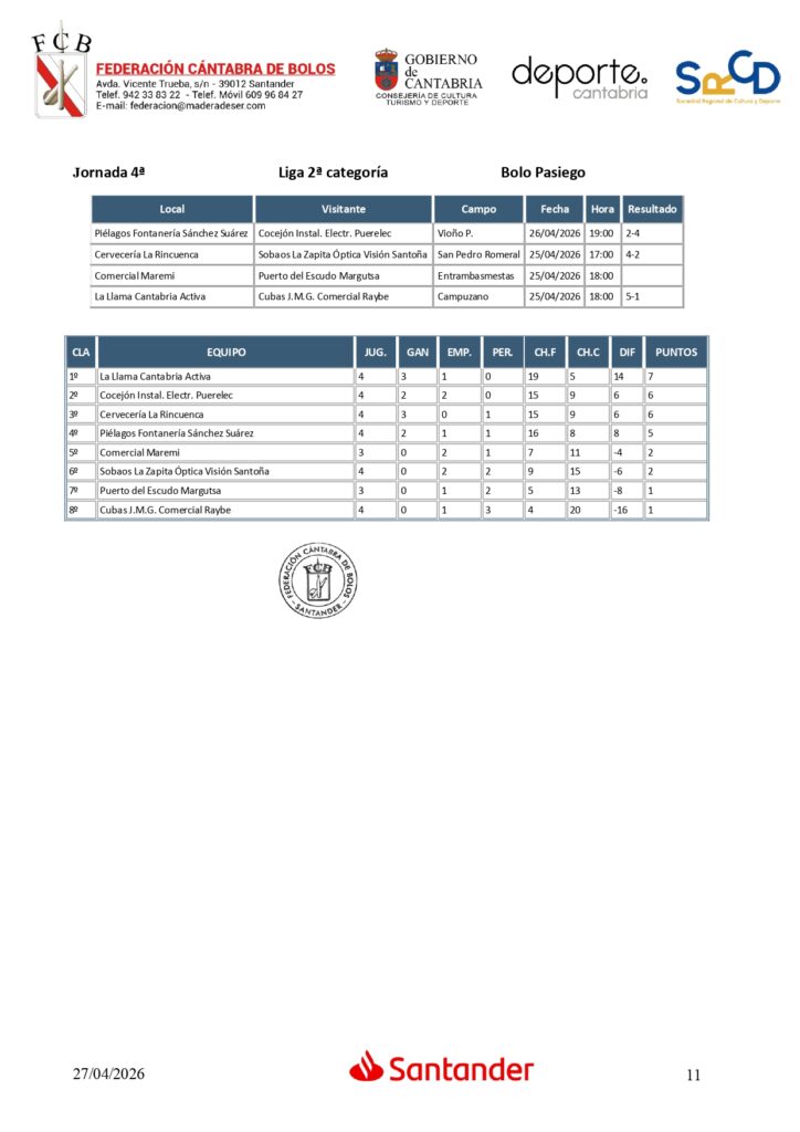 En Segunda categoría, La Llama Cantabria Activa, que se impuso en Campuzano a Cubas J.M.G. Comercial Raybe, es el nuevo líder con un punto más que Cocejón Instalaciones Eléctricas Puerelec y Cervecería La Rincuenca. Piélagos Fontanería Sánchez Suárez desciende a la cuarta plaza tras perder en Vioño.
