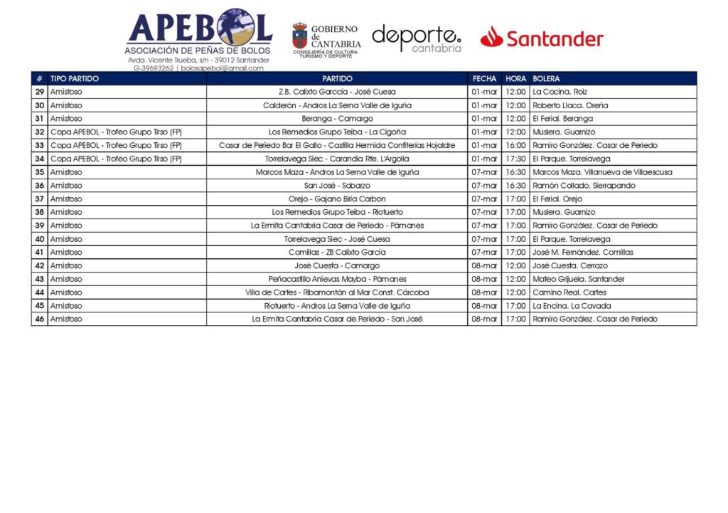 A pesar de que las condiciones climatológicas no son las mejores para la práctica de los bolos, los equipos de la Liga Santander se encuentran inmersos en la pretemporada y al margen de los entrenamientos, los partidos amistosos se suceden en estos días. Este lunes comienza la cuenta atrás para el inicio oficial de la temporada con la fase previa de la Copa Apebol-Trofeo El Corte Inglés, cuyos partidos se jugarán durante el fin de semana. Para el sábado 21 están previstos los encuentros: La Ermita Casar de Periedo-Camargo (17.00 horas), Los Remedios Grupo Teiba-José Cuesta (17.00 horas), Torrelavega Siec-Pontejos Manufacturas Deportivas (17.30 horas) y Ribamontán al Mar Construcciones Cárcoba-Club Bansander (18.00 horas); y para el domingo 22: Comillas-Gajano Birla Carbón (11.30 horas) y Hnos. Borbolla Villa de Noja-Sobarzo (17.00 horas).