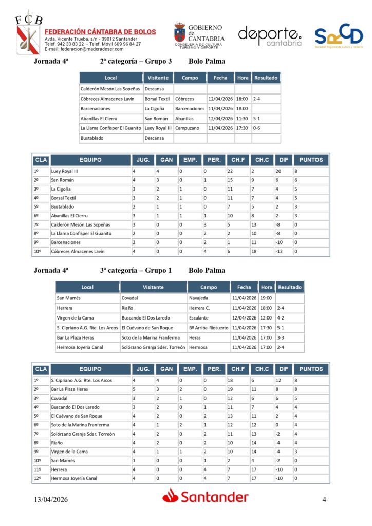 En la Segunda categoría, que ha disputado cuatro jornadas, Tanos Hakensa se mantiene como líder a pesar de no poder pasar del empate en la Mateo Grijuela ante Peñacastillo Anievas Mayba, que es tercero con los mismos puntos que Fernando Ateca y ambos a uno del líder.