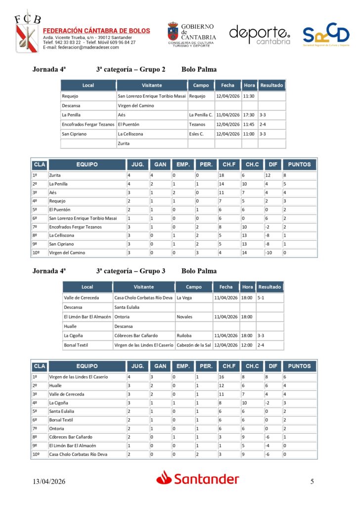 En el grupo 1 de Tercera categoría, San Cipriano A.G. Restaurante Los Arcos encabeza la clasificación, empatado a puntos con Bar La Plaza Heras, que ha jugado un partido más y está buscando un jugador para completar su plantilla; en el grupo 2, Zurita se ha colocado como líder, aprovechando el empate de La Penilla; y en el grupo 3, Virgen de las Lindes El Caserío se ha hecho con la primera posición de la tabla, con dos puntos más que Hualle y Valle de Cereceda.