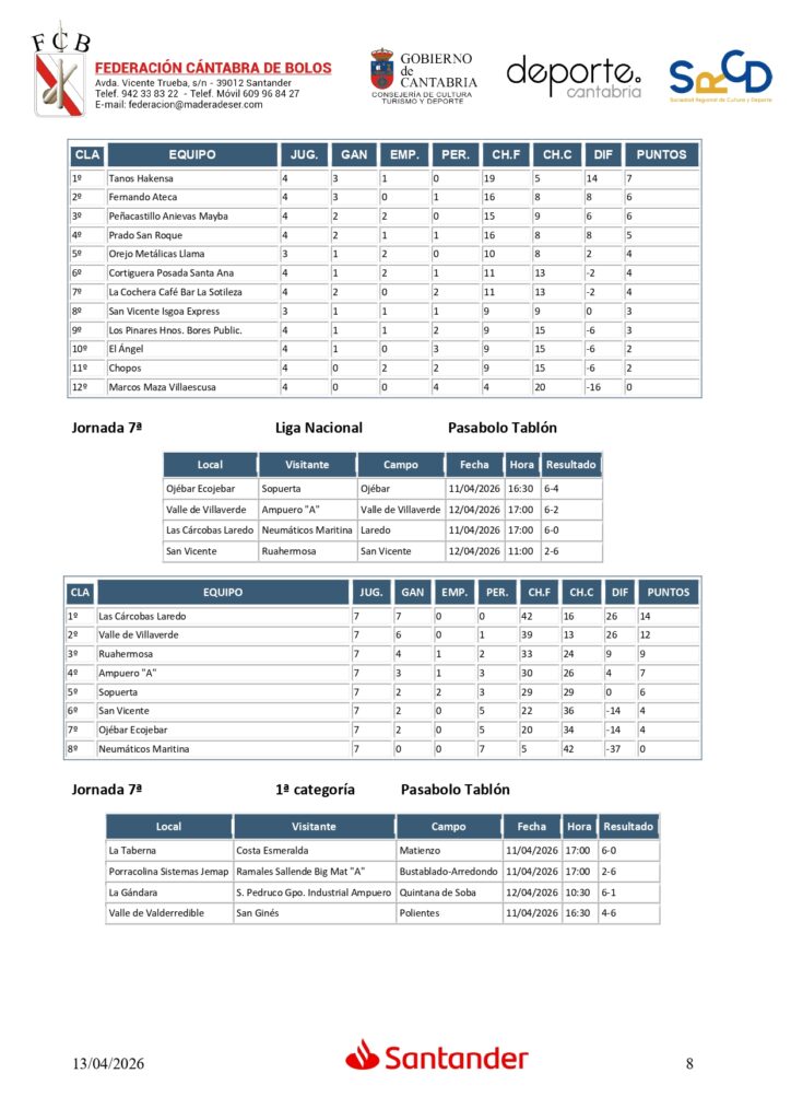 Séptima victoria consecutiva de Las Cárcobas Laredo, que parece lanzado a por un nuevo título de la Liga Nacional de pasabolo tablón, aunque solo supera en dos puntos a Valle de Villaverde, que también está realizando una gran temporada. Ruahermosa es tercero y Ampuero A, cuarto. Neumáticos Maritina sigue colista sin haberse estrenado, mientras que los vascos de Sopuerta y San Vicente son quinto y sexto, respectivamente.