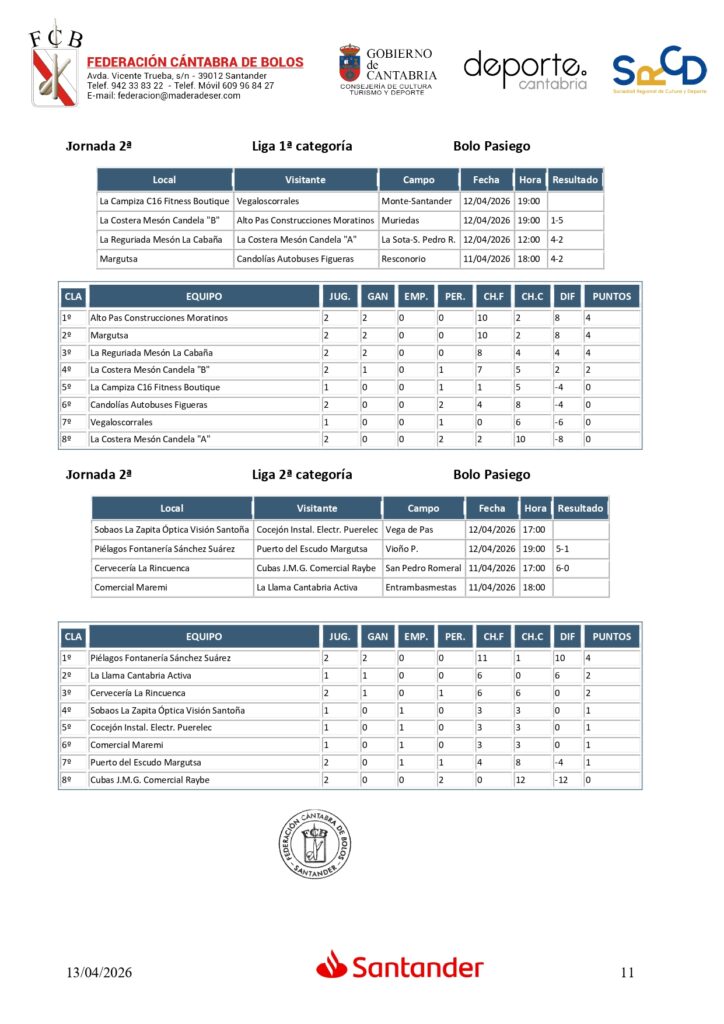 Segunda jornada en las Ligas de bolo pasiego. En Primera, Alto Pas Construcciones Moratinos y Margutsa están empatados a todo y por mejor ‘average’ se encuentran por delante de La Reguriada Mesón La Cabaña, que también ha ganado dos dos encuentros disputados; y en Segunda categoría, Piélagos Fontanería Sánchez Suárez aprovechó el ‘descanso’ de La Llama Cantabria Activa para ponerse al frente de la clasificación con dos puntos sobre los de Torrelavega, cuyo partido ante Comercial Maremi en Entrambasmestas fue aplazado. La tercera plaza, también con dos puntos, es para Cervecería La Rincuenca.