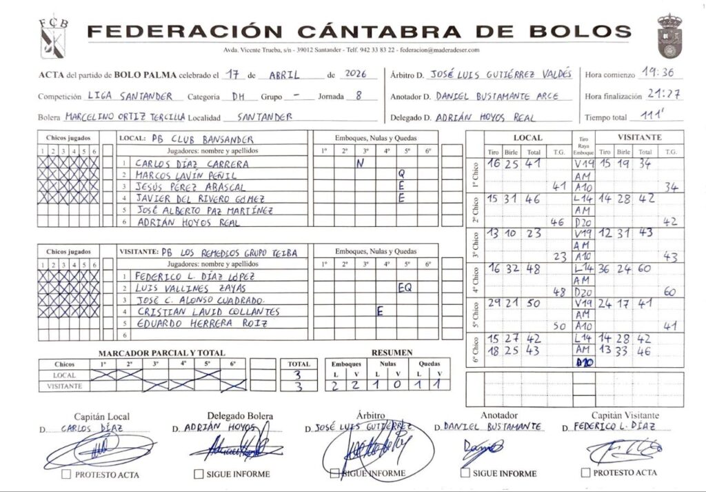 Comenzó ganando (2-0) el Club Bansander. En el primer chico, los santanderinos birlaron muy bien, aprovechando el ‘regalo’ de los de Guarnizo, que no acertaron con el birle (tres bolas seguidas de uno). En el segundo, Los Remedios no fue capaz de ‘matar’ los 46 de su rival. Los visitantes lograron acortar distancias en el marcador (2-1) lanzados por una bola de seis de Cristian Lavid. ‘Caballo’ de Carlos Díaz, que complicó en exceso las cosas para unos locales que ‘entregaron la cuchara’. Pero en el cuarto, Club Bansander volvió a cumplir desde 14 metros (raya alta a la mano con emboque de 20). Subieron 16 y birlaron 32 (siete de Rivero con la anteúltima bola y seis de Lavín con la última). Obligación para Los Remedios, que buscó el emboque y Lavid lo encontró (36 de tiro) y llegando a 60 bolas abajo.