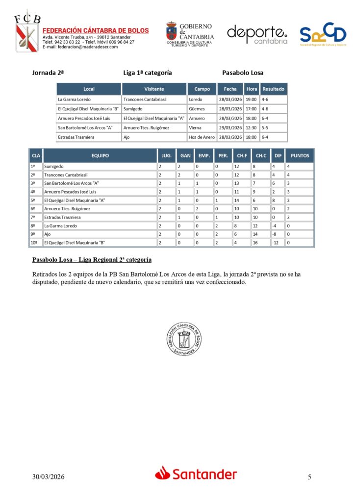 Solo se jugó la Liga de Primera categoría de pasabolo losa, que tras dos partidos deja solos en cabeza de la tabla a Sumigedo y Trancones Cantabriasil, únicos que han logrado las dos victorias, si bien San Bartolomé Los Arcos A y Arnuero Pescados José Luis también siguen invictos, pero ambos han sumado un empate.
