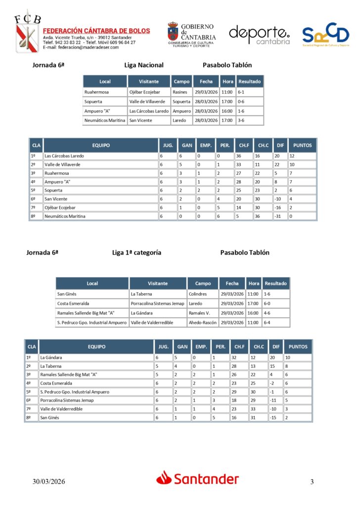 Nueva jornada en las Ligas de pasabolo tablón. Pocas novedades tanto en las partes altas como bajas de las clasificaciones. En la Liga Nacional, Las Cárcobas Laredo sigue su racha triunfal, habiendo sumado su sexta victoria consecutiva lo que le mantiene en lo alto de la clasificación, con dos puntos de ventaja sobre Valle de Villaverde, que se impuso en Vizcaya a Sopuerta, que ha caído hasta la quinta plaza, viéndose superado por Ruahermosa y Ampuero A, que ocupan la tercera y cuarta posición, igualados a puntos. Neumáticos Maritina es el colista sin haber todavía conseguido puntuar.