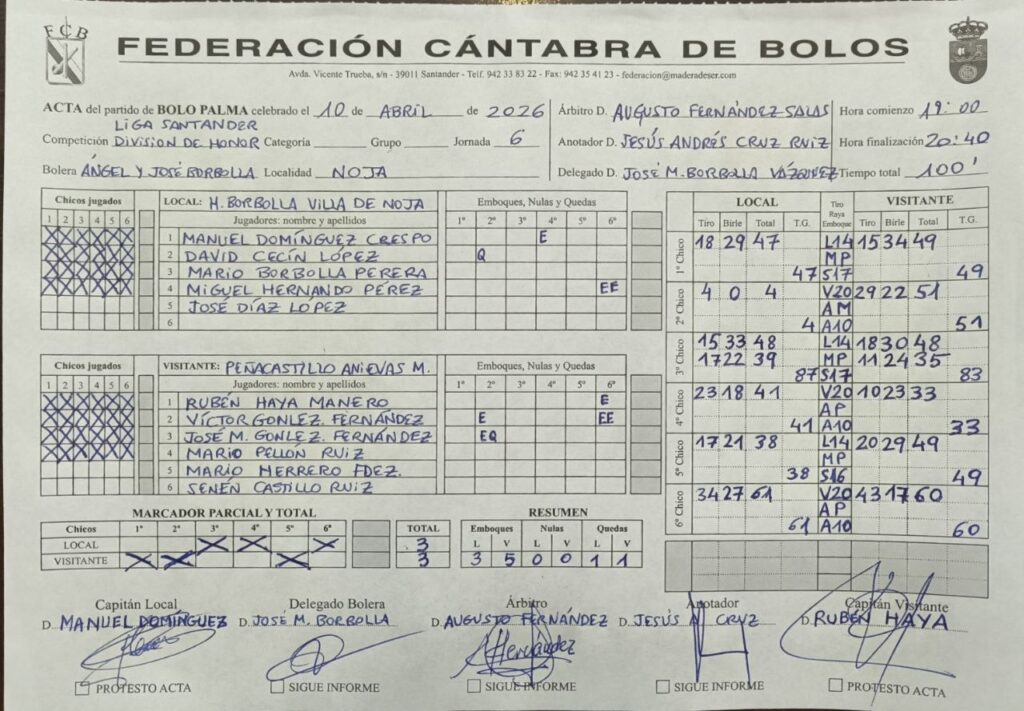 Algo más de una hora y media, con un chico de dos tiradas, pudieron disfrutar los aficionados que se acercaron hasta la bolera Ángel y José Borbolla del buen juego que desplegaron tanto Hnos. Borbolla Villa de Noja como Peñacastillo Anievas Mayba, que firmaron un empate que supone el primer punto perdido del líder en esta Liga Santander 2026, que este fin de semana disputa la sexta jornada.