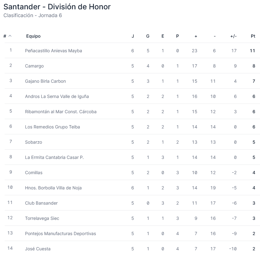 Pase lo que pase en el resto de la jornada Peñacastillo Anievas Mayba seguirá una semana más como líder, pero sí se puede apretar la clasificación. Camargo tiene la oportunidad de ponerse a un punto, pero para ello deberá ganar a un siempre difícil Ribamontán al Mar Construcciones Cárcoba; y a dos de los santanderinos aspira a situarse Gajano Birla Carbón, que recibe a un ‘herido’, después de sus tropiezos, Andros La Serna Valle de Iguña, que si logra los dos puntos acortará la diferencia con el primer clasificado.