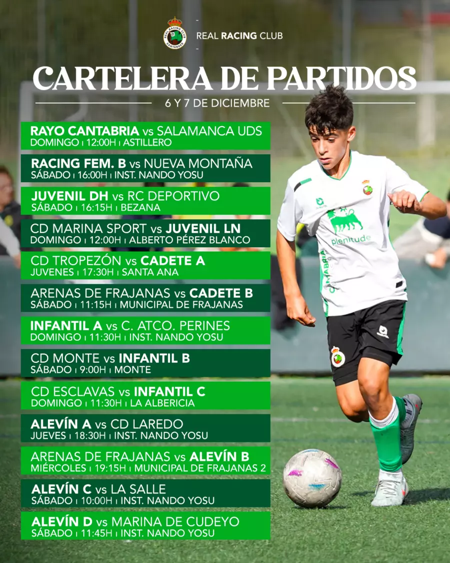 El Juvenil DH racinguista disputa el duodécimo partido del curso 2025/26 ante el RC Deportivo de La Coruña. El duelo de este fin de semana se disputará en el Campo Municipal de Bezana el sábado, 6 de diciembre, a las 16:15 horas. Los racinguistas tratarán de conseguir la cuarta victoria consecutiva tras imponerse en el último encuentro al Club Deportivo Lugo (1-3), con los goles de Alejandro Laso, Maruan Jakkal y Gabriel Jimenez. Por su parte, el cuadro gallego empató ante el Sporting de Gijón (1-1), con Pablo Suarez como único protagonista local.