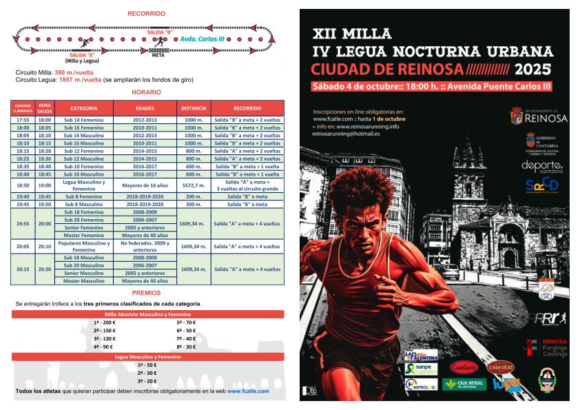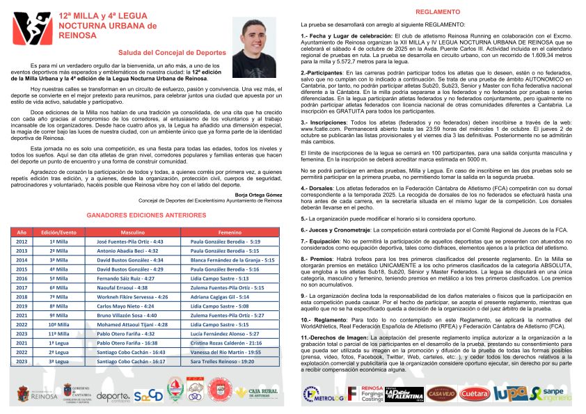 El club de atletismo Reinosa Running en colaboración con el Excmo. Ayuntamiento de Reinosa organizan la XII MILLA y IV LEGUA NOCTURNA URBANA DE REINOSA que se celebrará el sábado 4 de octubre de 2025 en la Avda. Puente Carlos III. Actividad incluida en el calendario regional de pruebas en ruta. La prueba se desarrolla en circuito urbano, con un recorrido de 1.609,34 metros para la milla y 5182,5 metros para la legua.