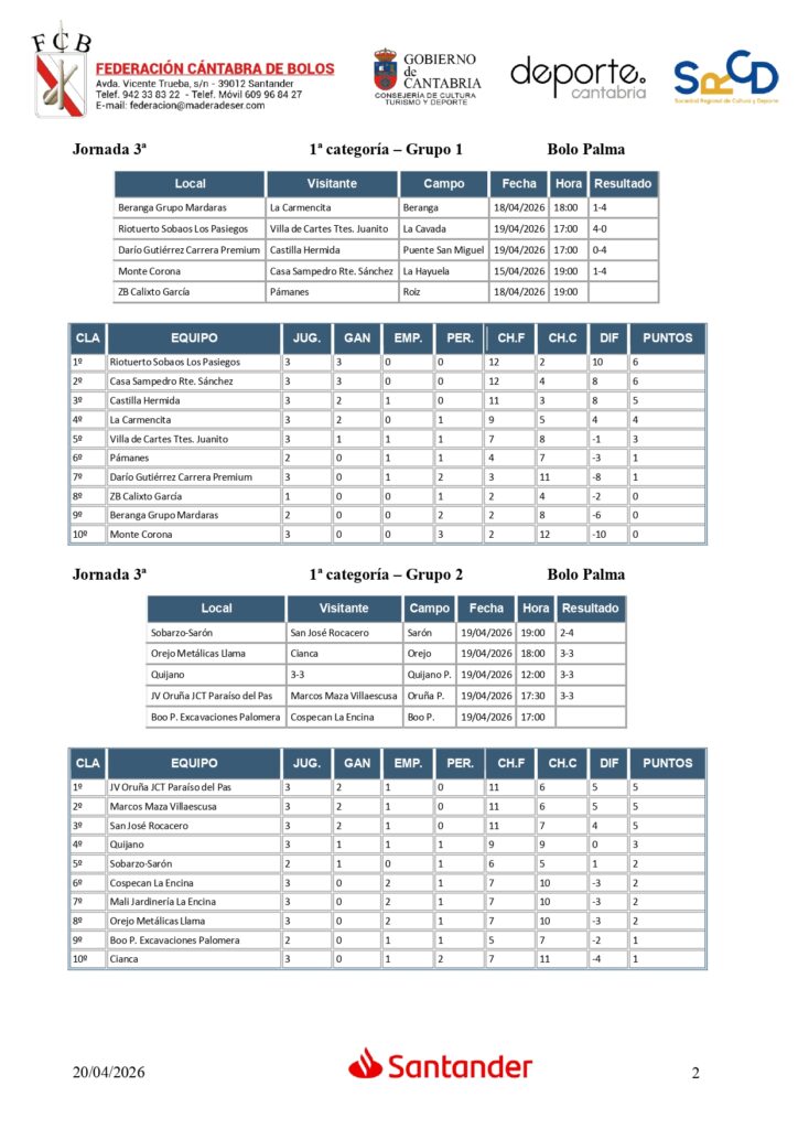 Las Ligas Regionales de bolo palma, al margen de la Liga Santander de la que nos hemos ocupado a lo largo del fin de semana, cumplieron una nueva jornada, la tercera en el caso de la Primera categoría en la que Riotuerto Sobaos Los Pasiegos y Casa Sampedro Restaurante Sánchez mantienen un interesante mano a mano en el que ninguno de los dos cede, habiendo logrado las tres victorias posibles con la diferencia de chicos favorable a los de La Cavada que ocupan la primera posición de la tabla. También en este grupo 1, Castilla-Hermida (en la fotografía superior) se mantiene invicto, aunque ya ha cedido un empate.