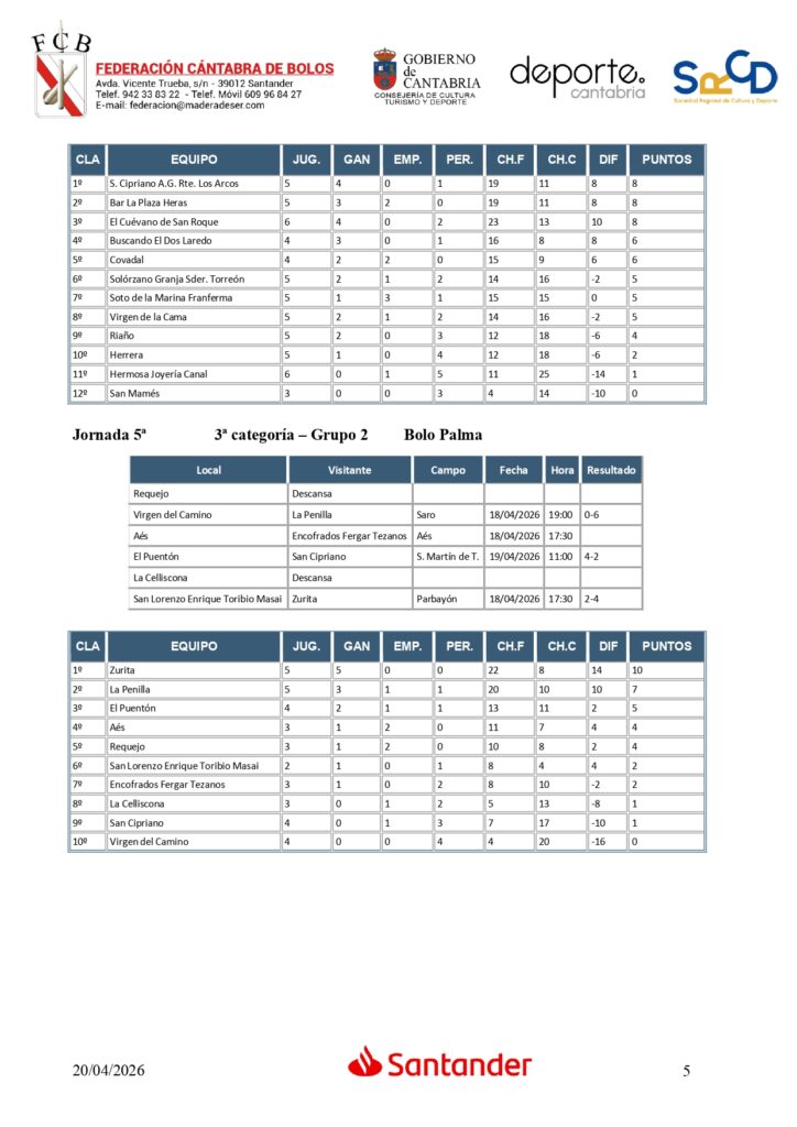 San Cipriano A. G. Restaurante Los Arcos, Bar La Plaza Heras y El Cuévano de San Roque están igualados a puntos en el grupo 1 de Tercera, mientras que en el grupo 2, Zurita sigue sumando de dos en dos, habiendo sumado los 10 puntos posibles. Por su parte, Virgen de las Lindes El Caserío manda en el grupo 3 sobre Borsal Textil que se ha colocado en segunda posición.