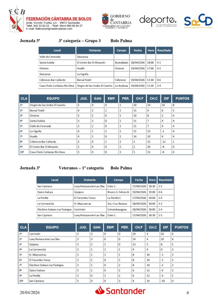 En la Primera categoría de veteranos, Carrimón y Luey Restaurante Las Olas cuentan sus partidos por victorias, habiendo sumado los seis puntos posibles, contando con uno más que Quijano, que se ha dejado uno por el camino. Y en Segunda categoría, Tanos Hakensa también suma y sigue, superando en un punto a Peñacastillo Anievas Mayba y Fernando Ateca, que han intercambiado sus posiciones.
