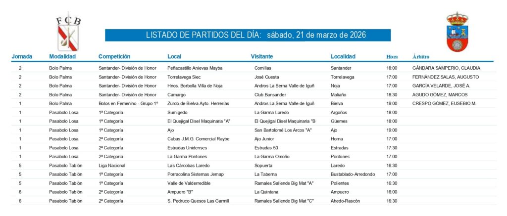 Por otro lado, la segunda categoría de bolo palma en ponerse en juego será la Liga Bolos en Femenino, aunque el pasado fin de semana ya se adelantaron dos encuentros -Torrelavega Siec ganó (4-2) a Las Cárcobas Clima Norte y El Cuévano de San Roque perdió (2-4) ante Carandía Restaurante L’ Argolla-. Esta temporada serán 15 equipos, que han sido divididos en dos grupos. El sábado, Zurdo de Bielva Ayuntamiento de Herrerías recibirá a Andros La Serna Valle de Iguña; y para el domingo están previstos los partidos: Covadal-San Jorge, Castilla-Hermida Confitería Hojaldres-Torrelavega Siec, Las Cárcobas Clima Norte-Camargo, La Cigoña-Atlético Deva y Peñacastillo Anievas Mayba-Casar de Periedo Bar El Gallo.