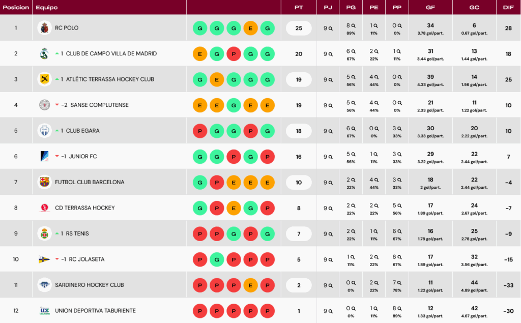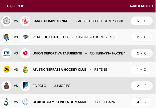 En casa ganaron por 2-0 Real Sociedad y Taburiente. Las guipuzcoanas al derrotar al Sardinero con el doblete de Luciana Molina, con las dos dianas desde el penalti córner. Mientras que las canarias sumaron los tres puntos en juego ante CD Terrassa con dos goles en los últimos cinco minutos, los de Aldana Boxer (m. 55) y de Micaela Andrada (m. 59).