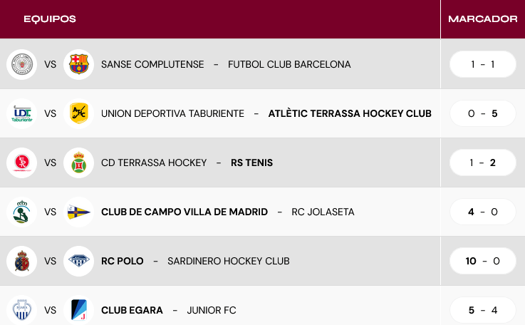 La única victoria a domicilio fue para la Real Sociedad de Tenis, con una valiosa victoria para los de Borja Movellán ante un rival directo, el CD Terrassa. No habían pasado 30 segundos cuando Isaac Lancelot adelantó a los cántabros. Empató Pau Petchamé desde el punto de penalti stroke en el minuto 2. Pero el segundo de Lancelot, en el 40, hizo que los tres puntos volaran de Les Pedritxes.