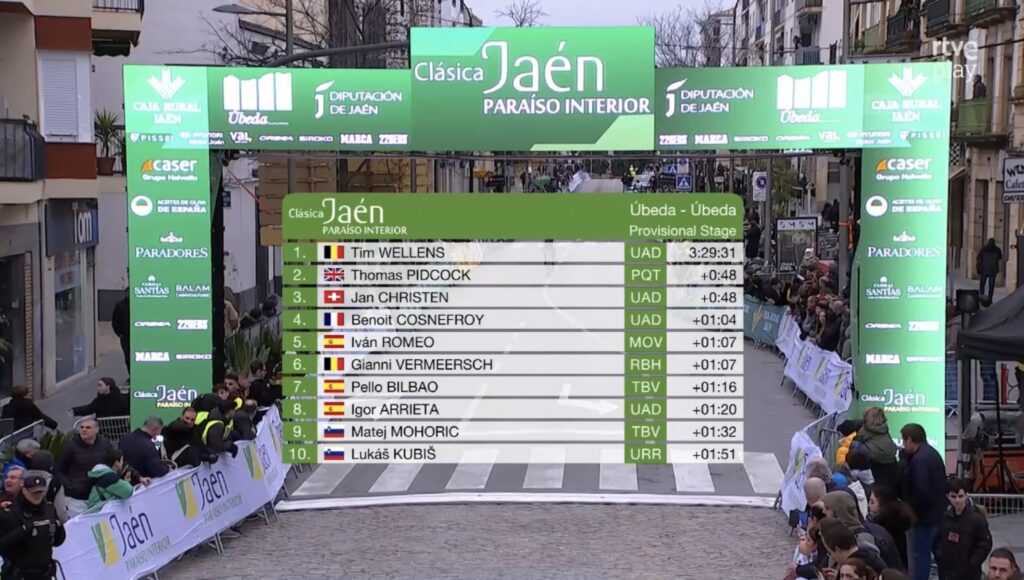 | En travesía definitiva por Mar de Olivos (km 144,1; 7,3 km), Pidcock aceleró junto a Van Gils con Christen a rueda en persecución de Wellens, logrando recortar la ventaja del belga a tan solo medio minuto. No obstante, el corredor de UAE Team Emirates consiguió mantenerles a raya para alzar los brazos frente al Hospital de Santiago de Úbeda. A su espalda, el trío perseguidor se jugaba el segundo puesto, que caía en el haber de Pidcock mientras Van Gils se iba al suelo en la ‘volata’ final debido a una maniobra que costó la descalificación a Christen. Así, el tercer cajón del podio correspondió a Benoît Cosnefroy (UAE Team Emirates), que originalmente cruzó cuarto la línea de meta por delante del campeón de España, Iván Romeo (Movistar Team). |