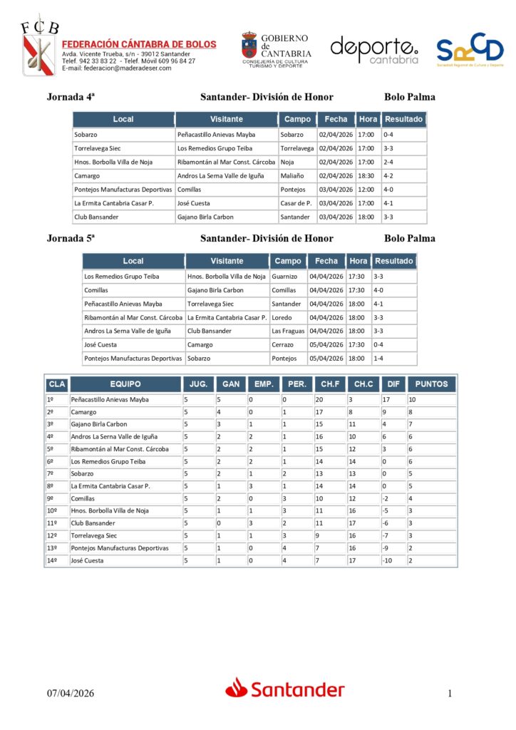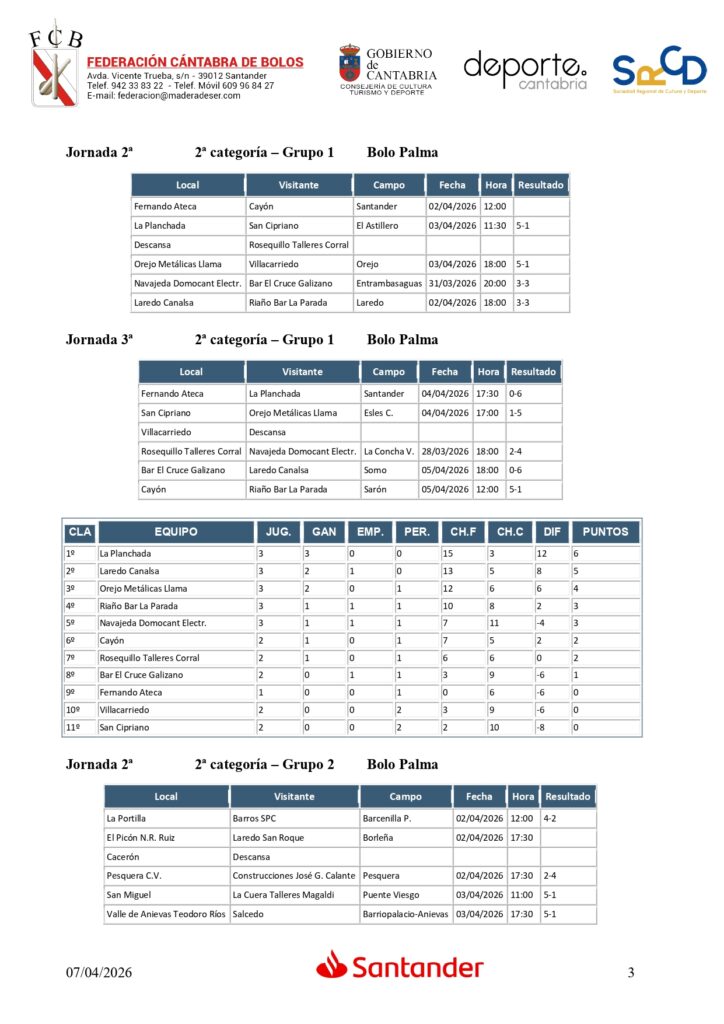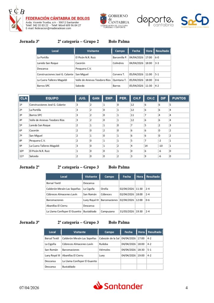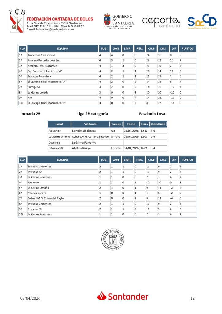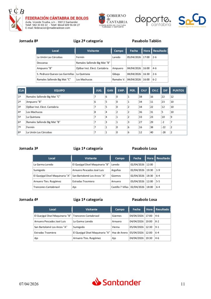 La Liga Nacional y la Primera categoría de pasabolo tablón aprovecharon la Semana Santa para tomarse un descanso. Sí jugaron los equipos de Segunda y Ramales Sallende Big Mat C sigue al frente de la clasificación, con dos puntos de ventaja sobre Ampuero B, Ojébar Inst. Elect. Cantabria y Los Machucos.