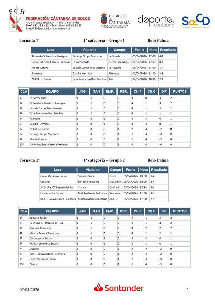 Con el comienzo de la Primera categoría, todas las Ligas Regionales -a excepción de los menores- ya se han puesto en marcha. En la antesala de la Liga Santander no hubo sorpresas ganando La Carmencita, Riotuerto Sobaos Los Pasiegos, Villa de Cartes Ttes. Juanito y Casa Sampedro Restaurante Sánchez, en el grupo 1; y Sobarzo-Sarón, Junta Vecinal de Oruña JCT Paraíso del Pas, San José Rocacero y Marcos Maza Villaescusa, en el grupo 2.