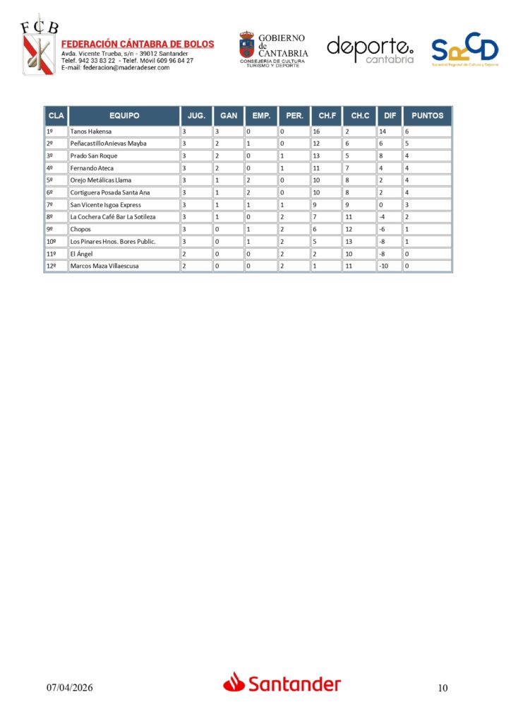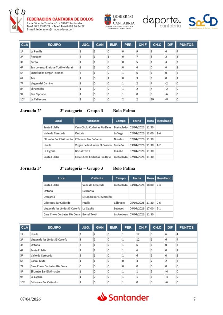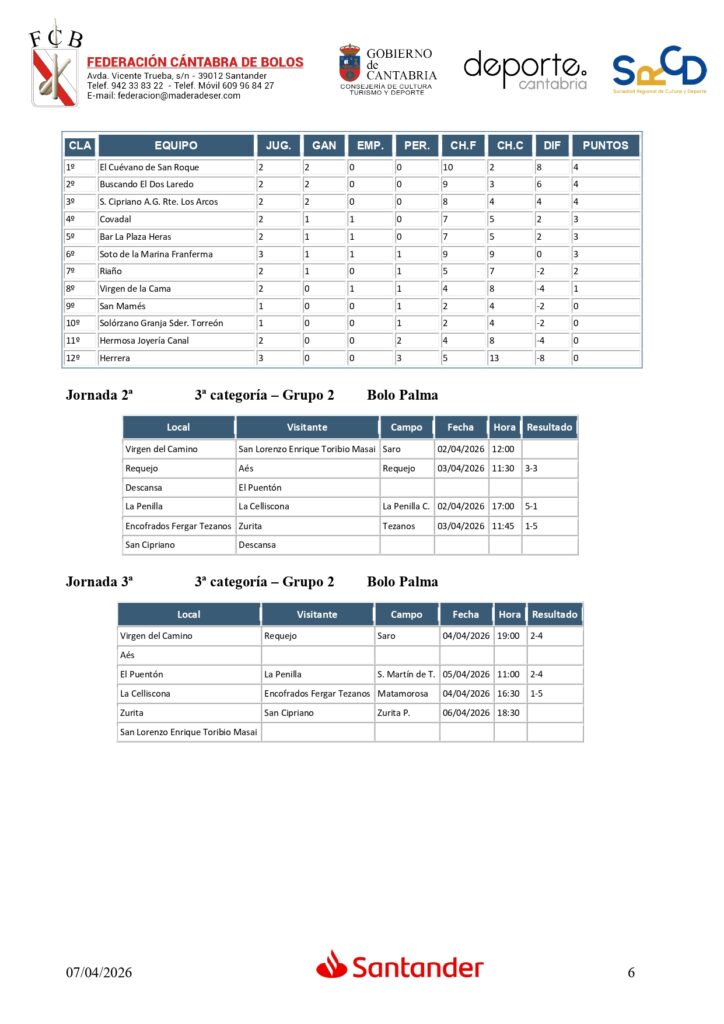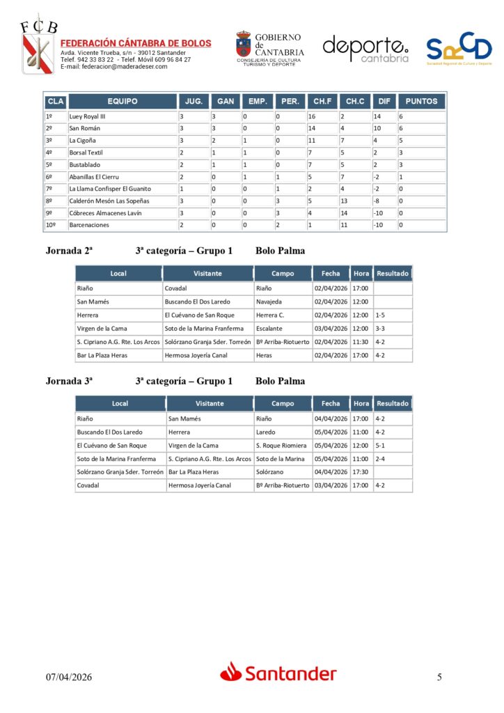 En Tercera categoría, El Cuévano San Roque, Buscando El Dos Laredo y San Cipriano A. G. Restaurante Los Arcos encabezan la clasificación, igualados a puntos, en el grupo 1; La Penilla es líder en solitario del grupo 2; y Hualle y Virgen de Las Lindes El Caserío mandan empatados el grupo 3.